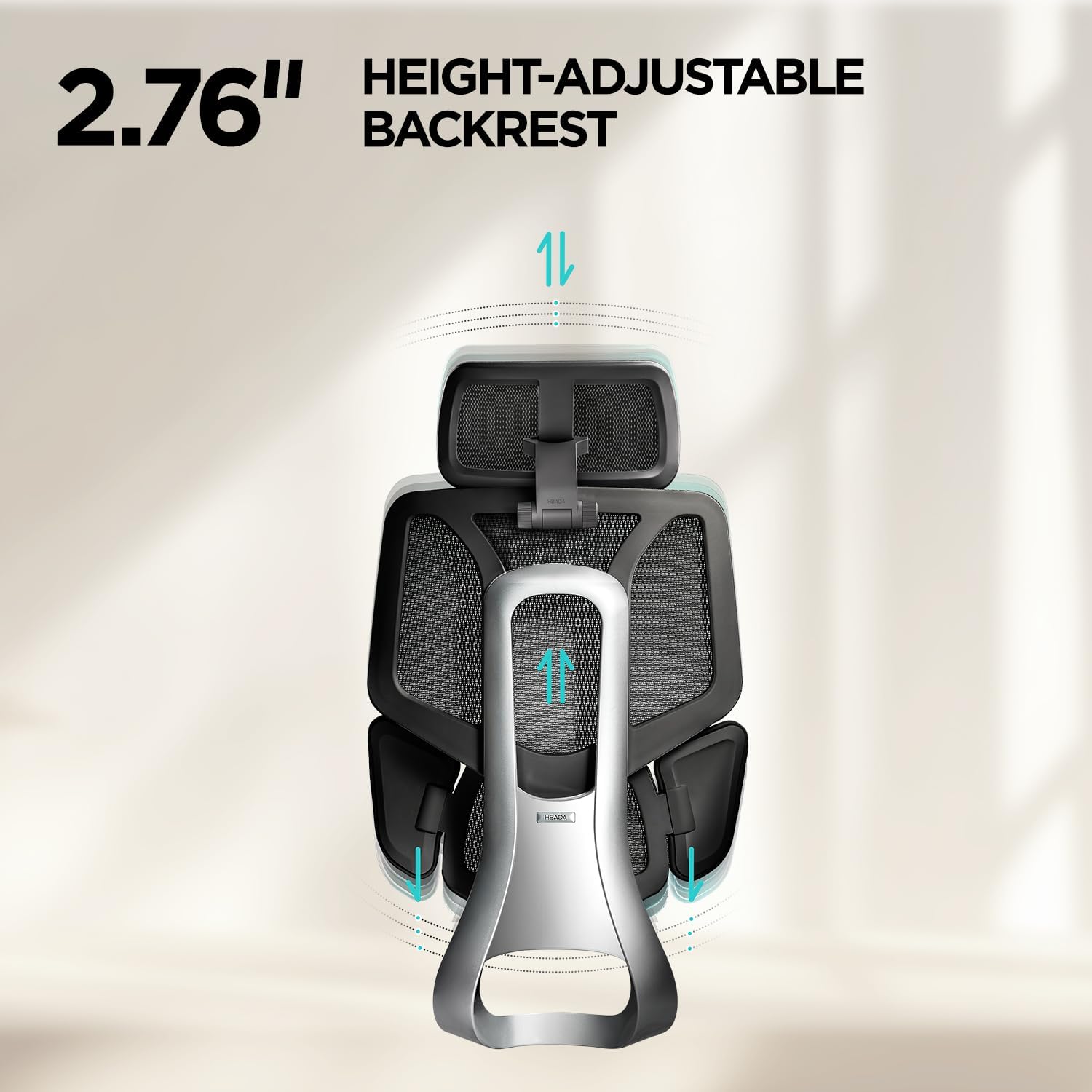 T-Shape Support System E3 Air ergonomic chair's T-Shape Support System is originally created by . It solves the discomfort caused by the "3 kinds of hurts resulted from long-time sitting" by supporting the [neck - waist - shoulder]. The liftable backrest has a nine-position adjustment, allowing for 2.76" of up and down movement, making it suitable for individuals of varying heights. When adjusted to the highest position, it automatically returns to the lowest level.(Headrest and lumbar support also adopt this cycle gear adjustment.)
