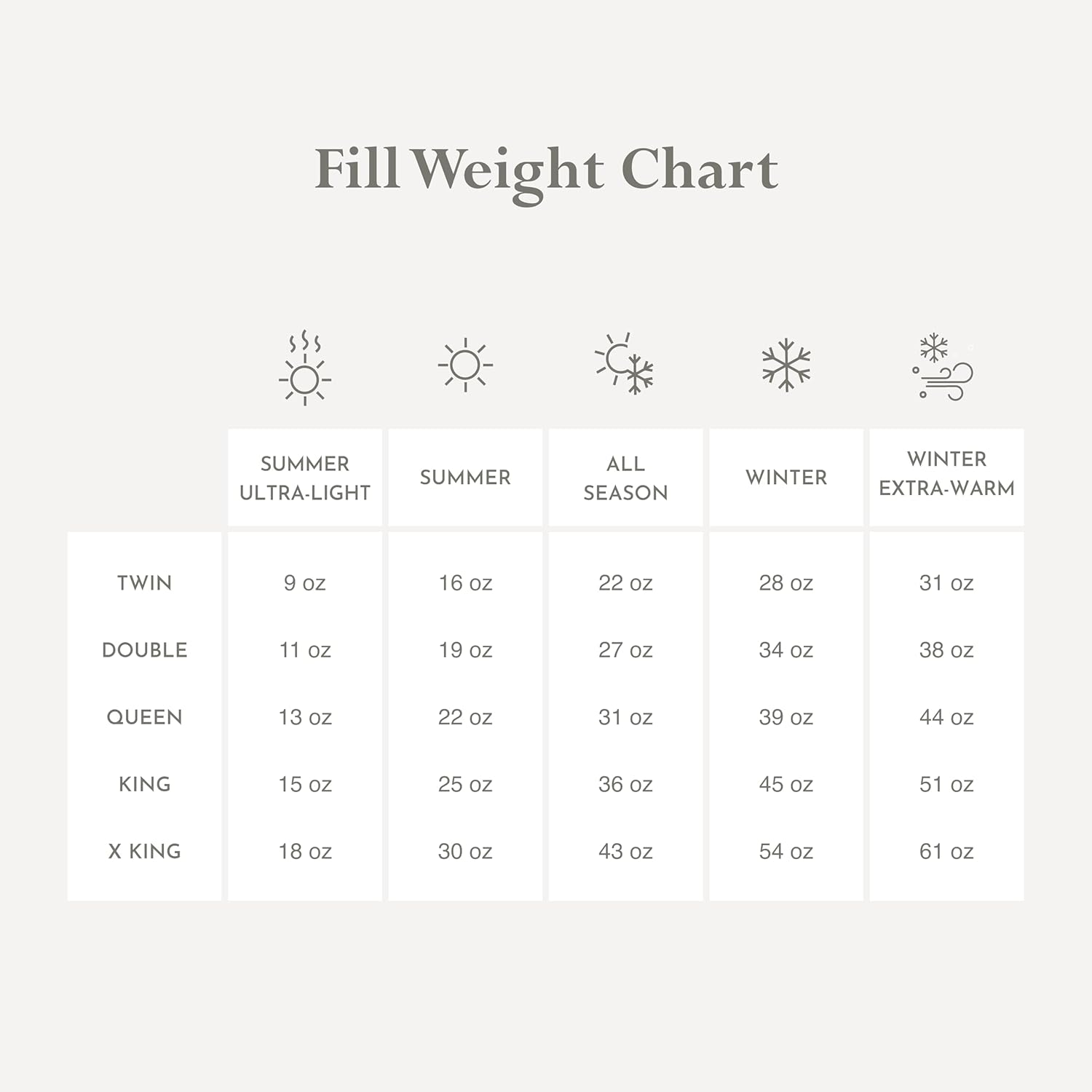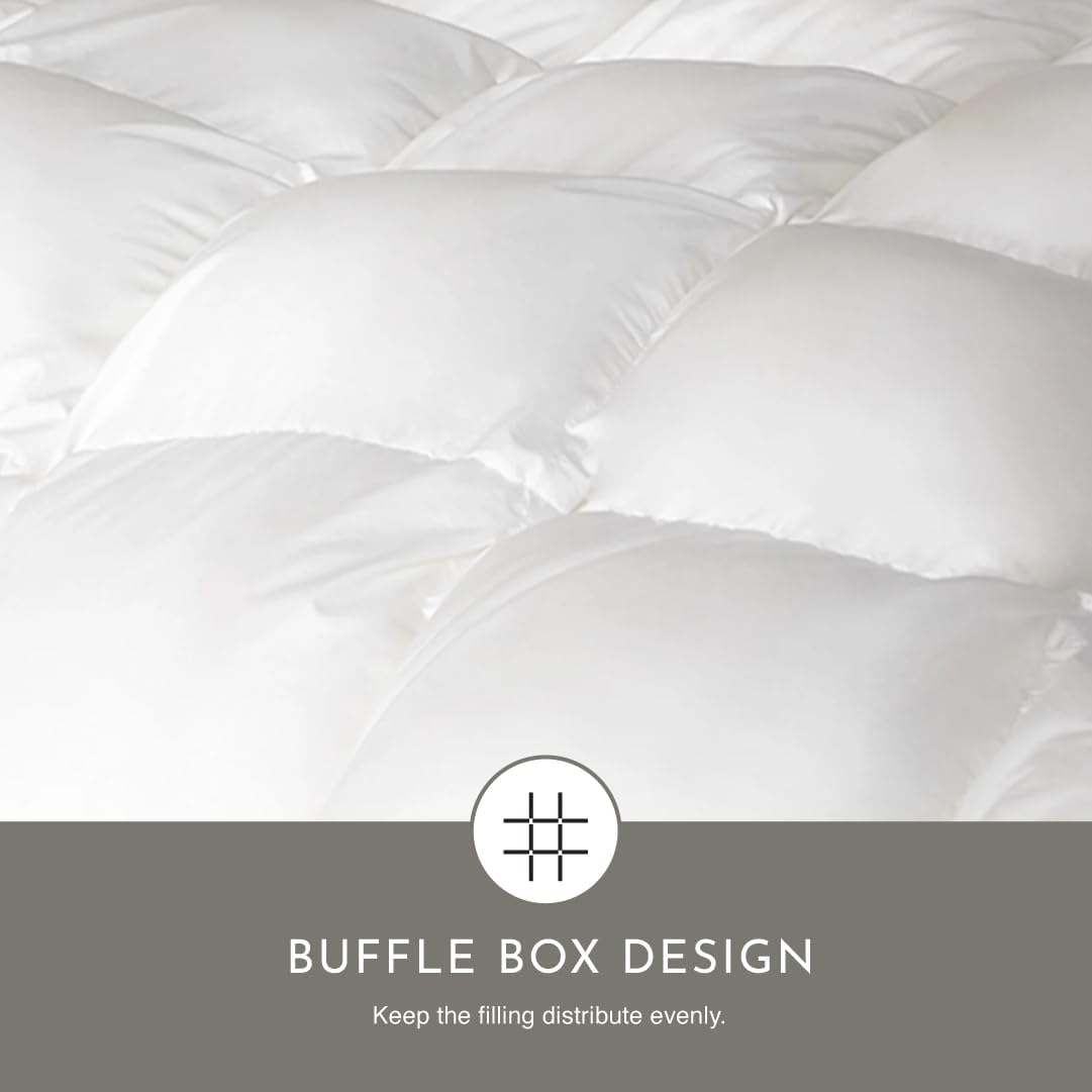 725 Loft European White Duck Down Filled with a minimum of 80% ethically sourced European white duck down cluster at 725 fill power, with the remaining 20% consisting of natural down fibers and minimal feather content resulting from down processing and transportation. This premium down comforter (also known as down duvet or duvet insert) offers premium soft and lightweight warmth. Its superior natural insulation provides luxurious comfort with excellent temperature regulation for optimal sleep.