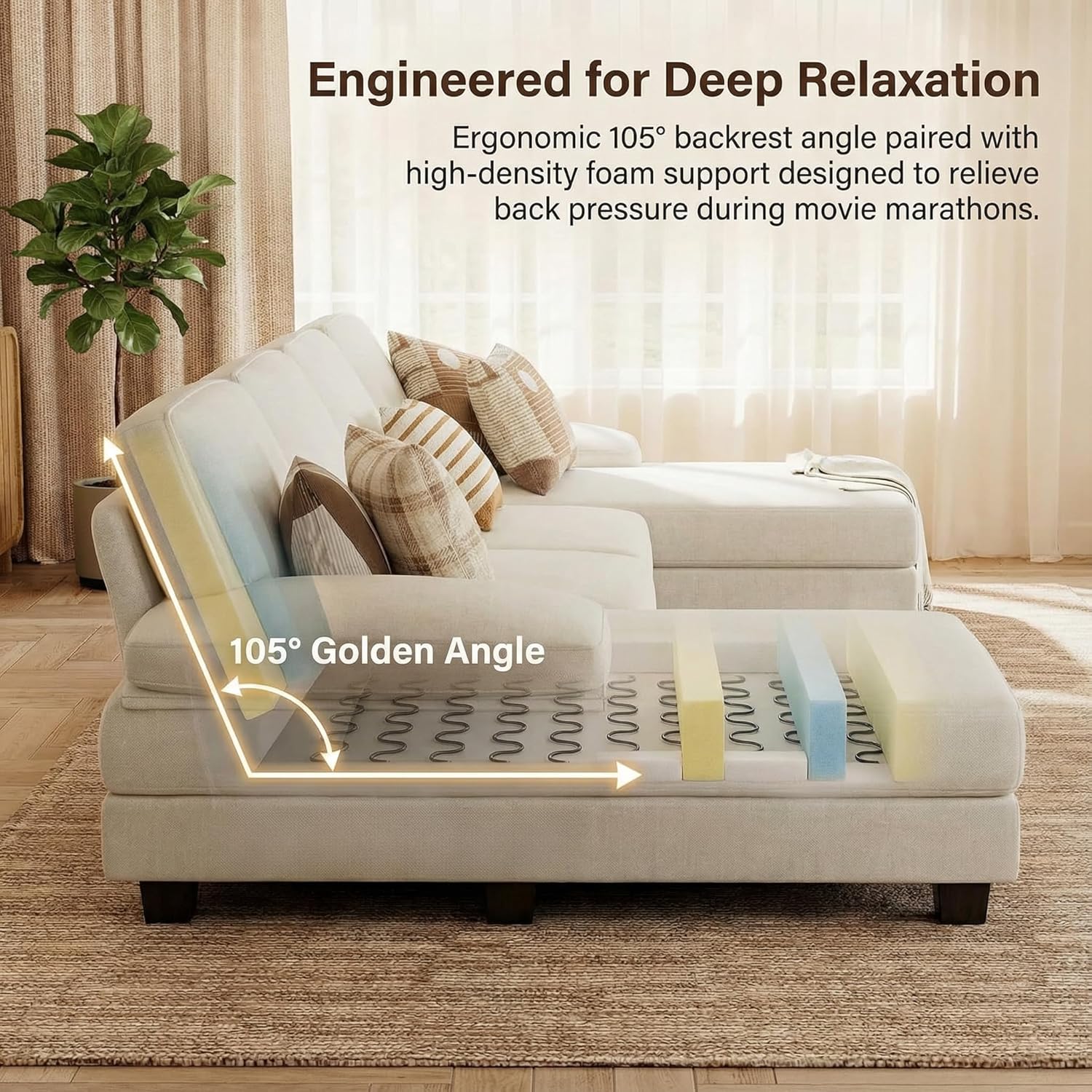 Optimal Dimensions - Our U-shaped sofa couches measures 106"W x 47.8"D x 32.2"H, providing excellent leg support. This ideal size strikes a balance between spacious comfort and compact design, making it suitable for smaller living spaces as well as cozy corners in larger homes.
