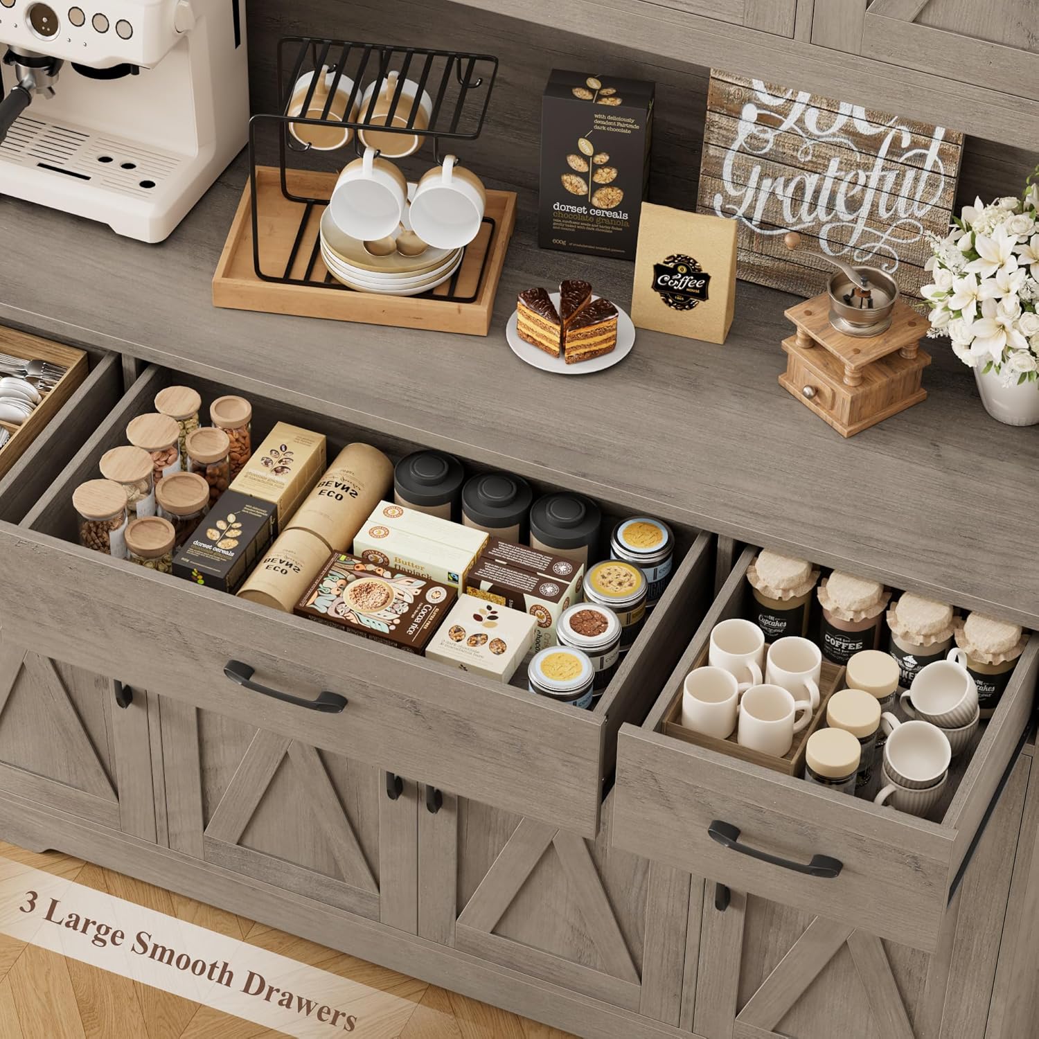 Multi-Purpose Pantry: Designed for versatility, this cabinet effortlessly switch roles from food pantry in kitchen to organize caos, dining room buffet hutch cabinet to entertain guests, to living room appliance cabinet to showcase your coffee bar - It's your home's most adaptable storage piece