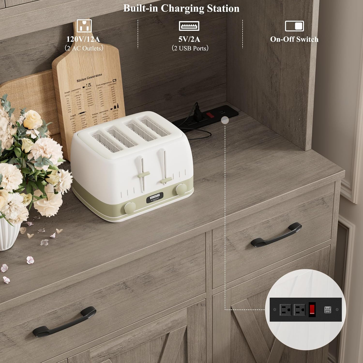 Charging Station: Featured a built-in charging station with 2 AC outlets, 2 USB ports and a handy switch, this tall pantry cabinet powers conveniently home appliances like toaster and coffee maker while providing quick power on and off for enhanced safety and reliability. Moreover, there is a wire hole to keep desktop tidy
