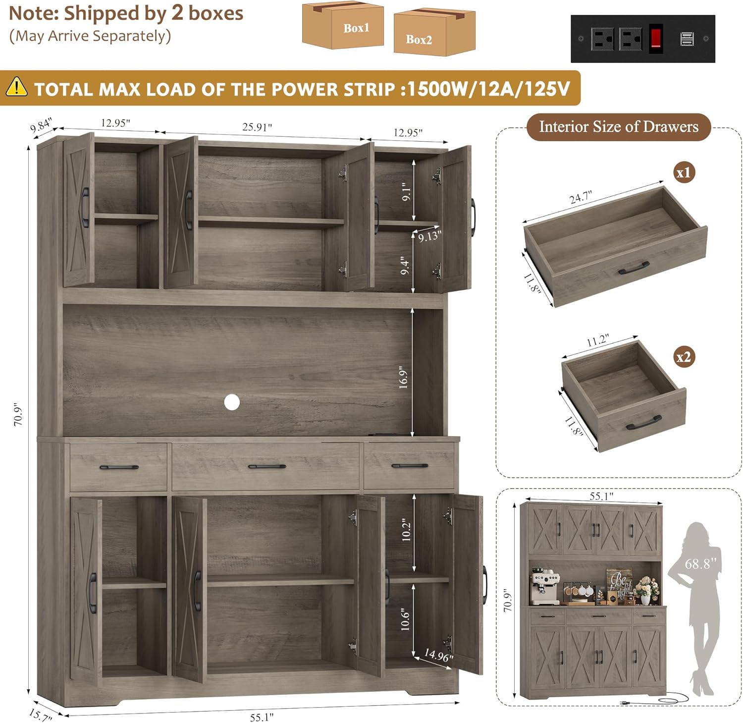 • 71" Tall Pantry Cabinet with Charging Station, 55" Wide Kitchen Pantry Storage Cabinet with Countertop, Large Kitchen Hutch with Storage Drawers and Microwave Stand for Dining Room, Ash Grey