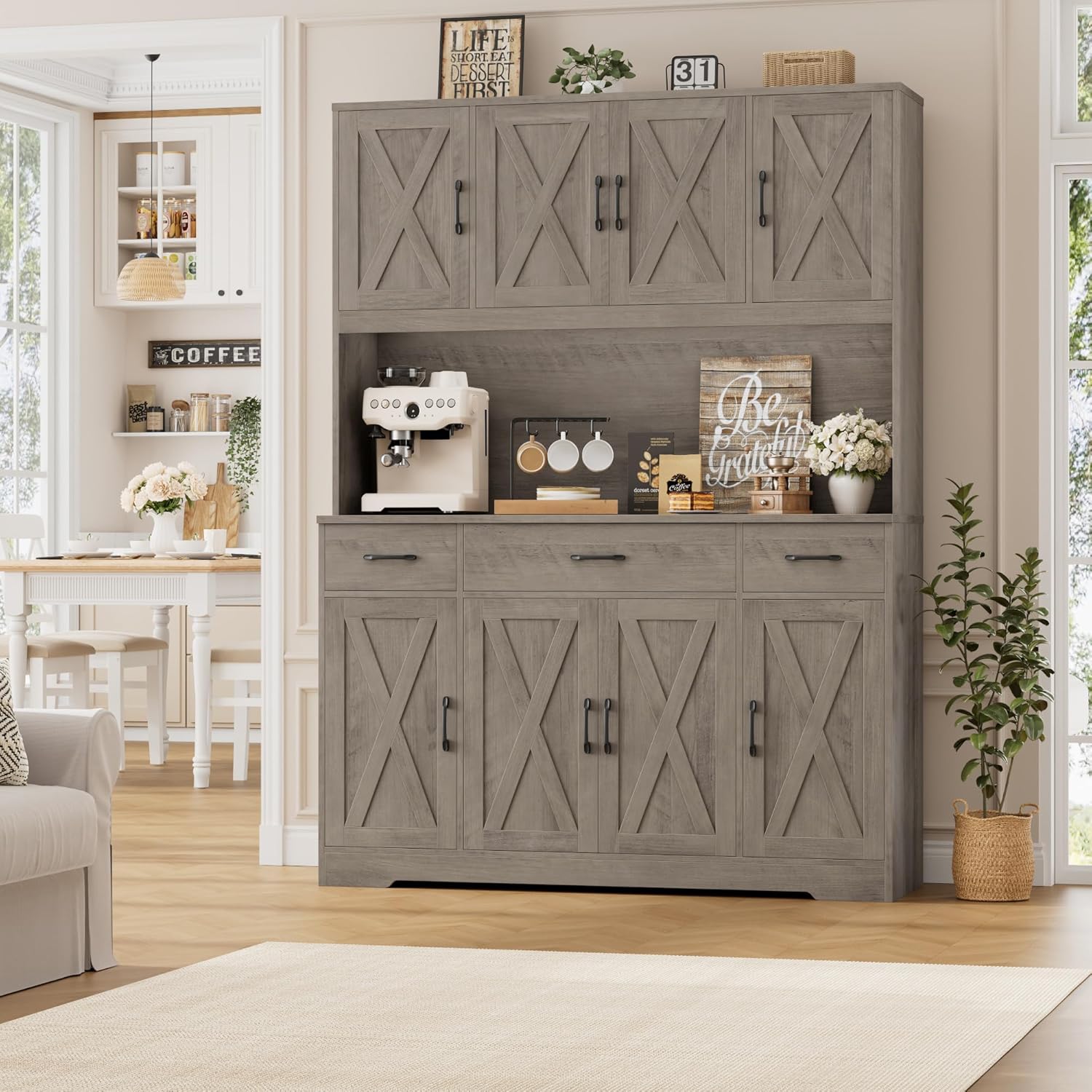 Modern Farmhouse Hutch: Warm wood finish, striking X-grain barn door and two-tone design, all of which combines rustic appeal with contemporary style in this white pantry cabinet in a beautiful way that complements perfectly into any space
