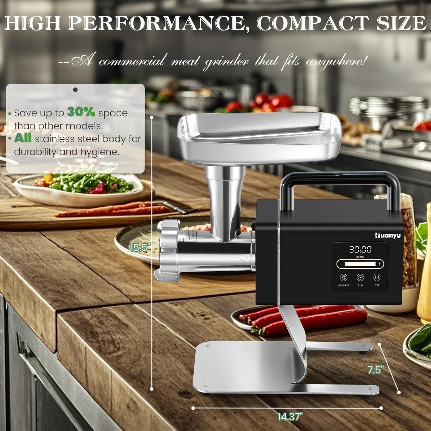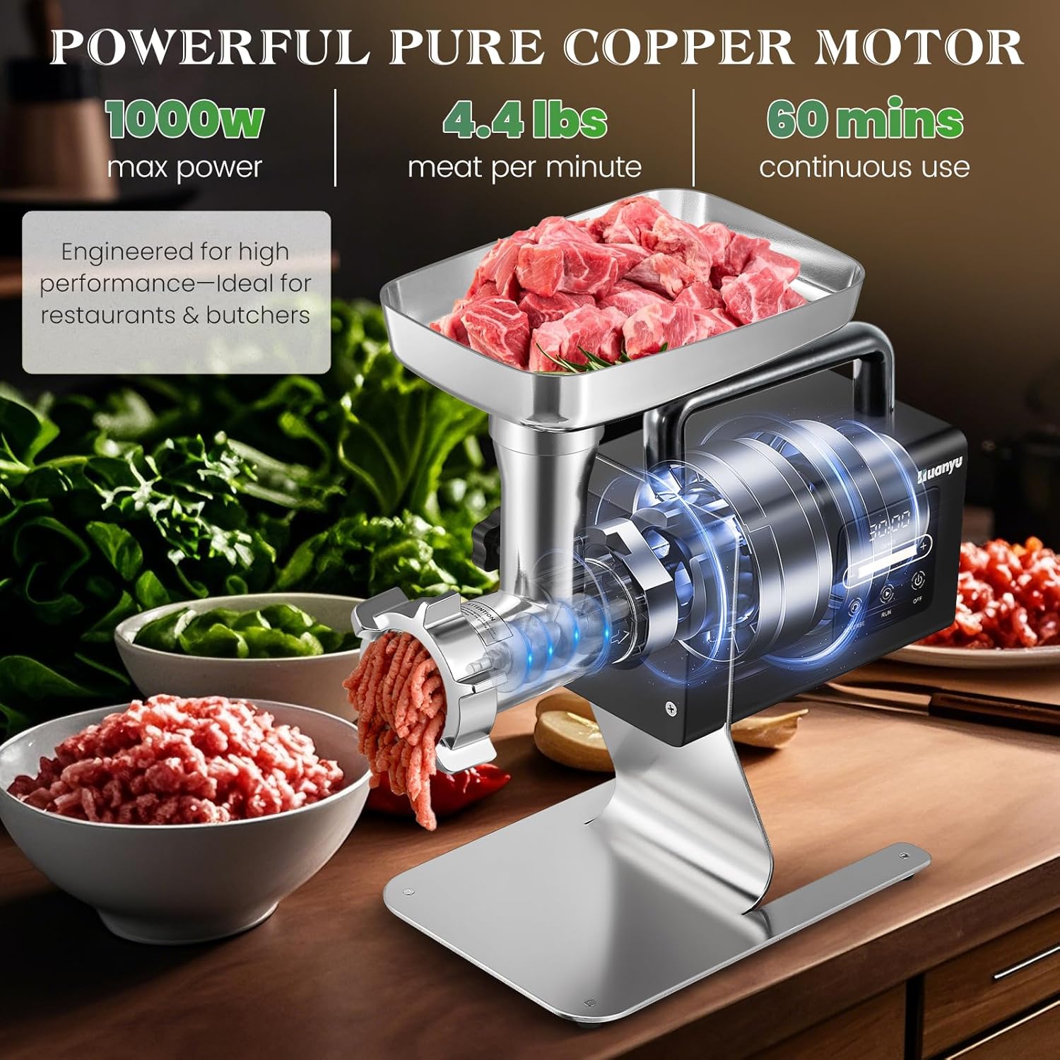 [High-power 1.3HP motor] Featuring a robust pure copper motor, this meat grinder processes up to 4.4 lbs of meat per minuteeven with tough cuts and bones. It runs continuously for 60 minutes without overheating, ensuring peak performance in high-demand settings