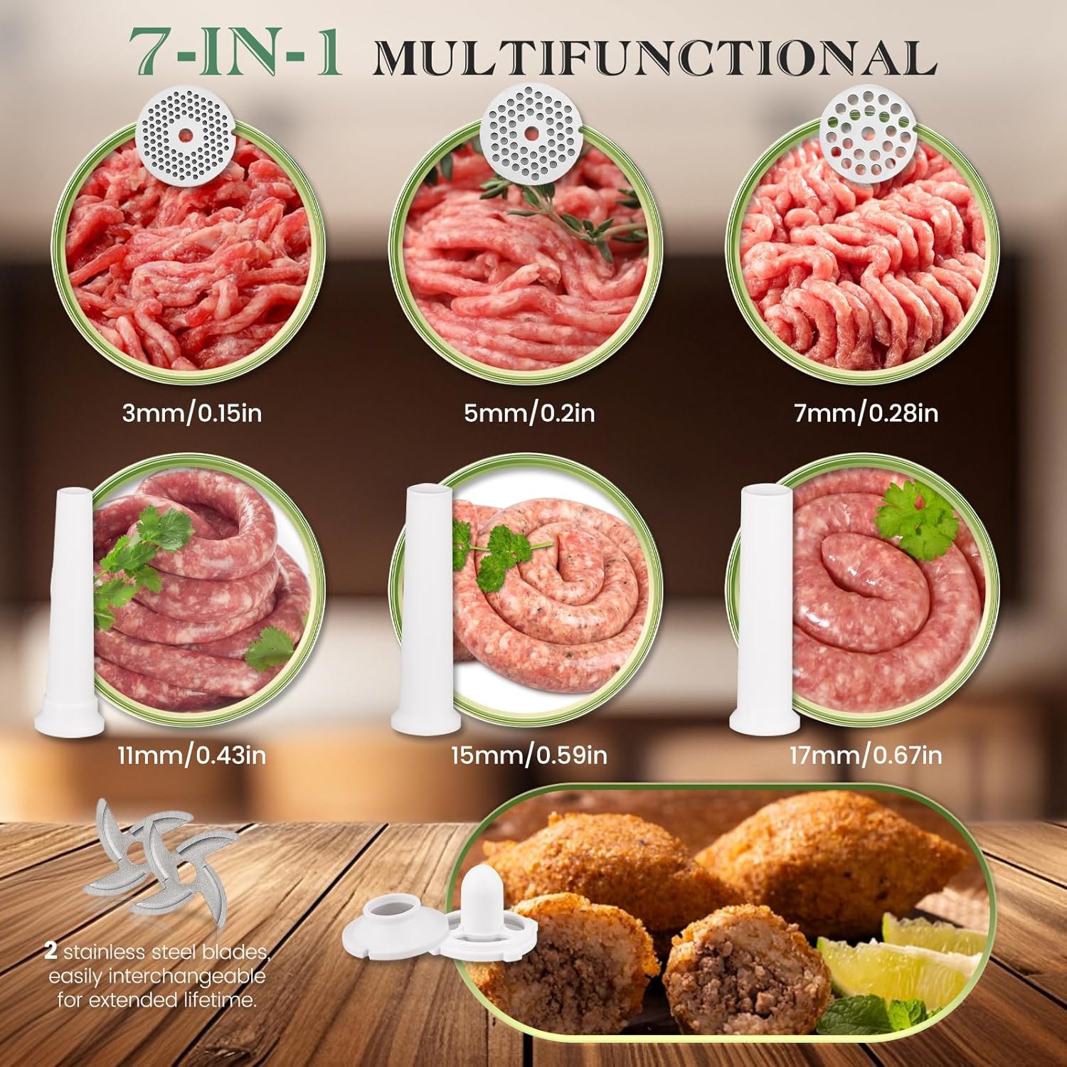 [Versatile meat grinder] This grinder comes with three stainless steel plates (3mm, 5mm, 7mm) for adjustable textures, plus a sausage tube kit and Kubbe kit for making homemade sausages and Kubbe. Equipped with two stainless steel cross blades for added durability and long-term use