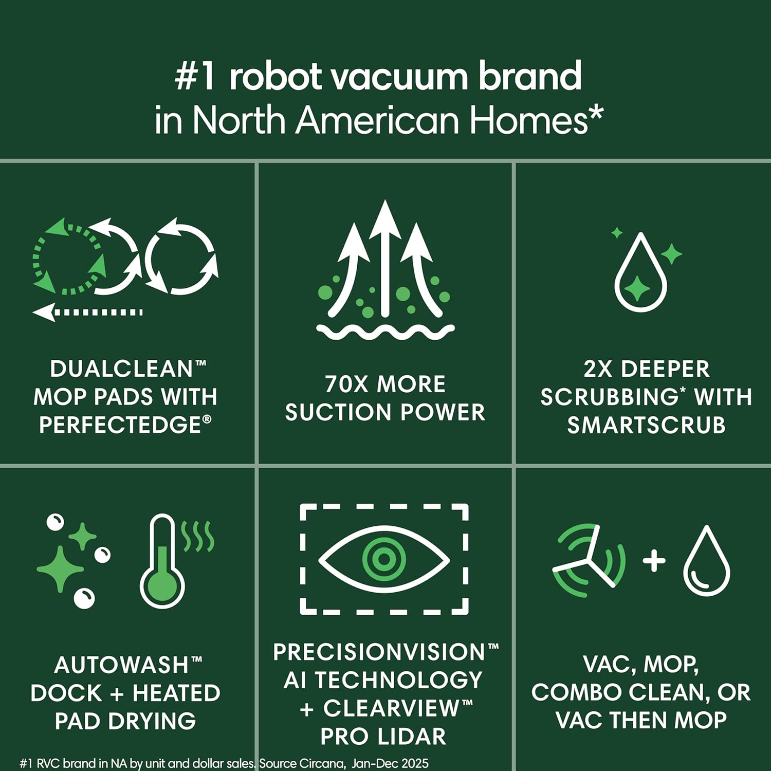 The Roomba Plus 505 Combo Robot with AutoWash Dock delivers cleaning innovation with an edge. Effortlessly combining advanced vacuuming, deep-scrub mopping, DualClean Mop Pads with PerfectEdge, and a does-it-all AutoWash Dock to deliver the clean of your dreams. Expertly raises the cleaning bar with spinning DualClean Mop Pads that extend along edges for 18% more coverage* to erase dirt wall-to-wall and SmartScrub for 2x deeper scrubbing**. Plus, 70x more intense suction***, Carpet Boost, a multi-surface rubber brush, and Edge-Sweeping brush extract and eliminate dust and debris. AutoWash dock does more to maintain all-around freshness. Self-empties to capture up to 75 days of debris in a bag that keeps allergens and dust locked away. Never drag dirt around the house - your robot periodically returns to the dock to rinse its mop pads during cleaning. When cleaning is finished, your mop pads are washed and heat-dried, always ready to clean. The Self-Cleaning Cycle eliminates any build-up of debris in the dock with little effort from you. ClearView Pro LiDAR quickly maps your home to maximize coverage and clean thoroughly, day or night. The robot steers smoothly around obstacles and won't fall down stairs thanks to specialized sensors. Immediately recognizes cords, socks, and pet waste using PrecisionVision AI technology. Advanced Dirt Detect Technology identifies large wet & dry messes ahead and automatically repeats cleaning passes for a more thorough clean without missing a thing. Ask your preferred voice assistant**** to get a routine started or simply tap the easy-to-use Roomba Home App to set a perfect clean for each area in your home. Choose from 4 cleaning modes to vacuum, mop, combo clean, or vacuum first then mop. Select repeat mopping passes in high-traffic areas, even mop the kitchen at night. Inspired by modern design, both robot and dock blend beautifully into your home. One powerful robot is all you need for effortlessly fresh carpets and glistening floors. *Compared to unextended DualClean Mop Pad **Compared to standard vacuum & mop mode on coffee & grime ***Compared to Roomba 600 series robots ****Works with Alexa, Siri, and Google Assistant-enabled devices. Alexa and all related logos are trademarks of Amazon.com or its affiliates. Google and Google Home are trademarks of Google LLC. Siri is a registered trademark of Apple Inc., registered in the U.S. and other countries and regions.