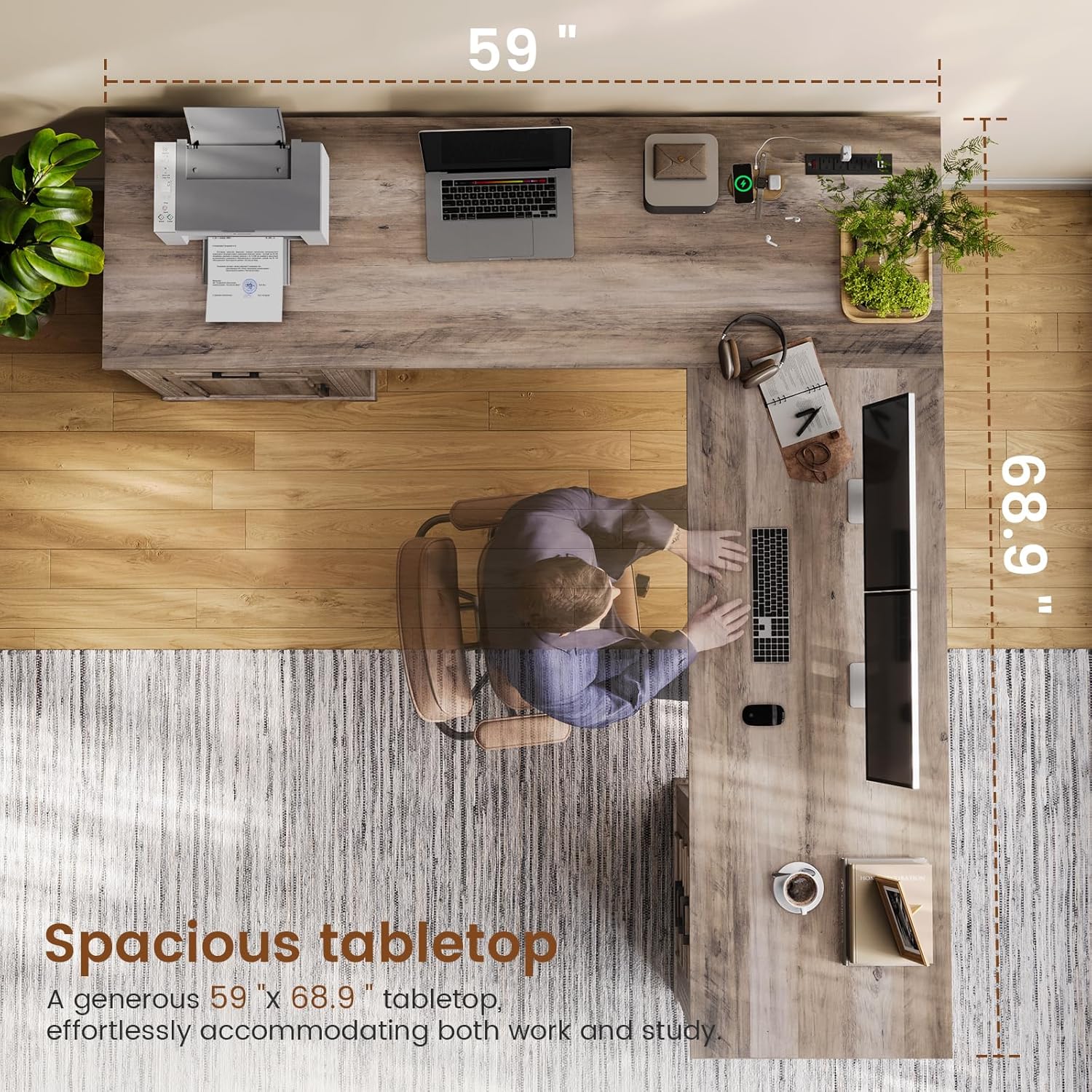 Spacious SpaceThis executive L shaped desk has a spacious desktop. The desktop size is 69"L*21.6"W and 59"L*21.6"W. This spacious executive desk provides ample space for files, computers. This sleek farmhouse l shaped desk is the perfect addition to any home office desk setup.