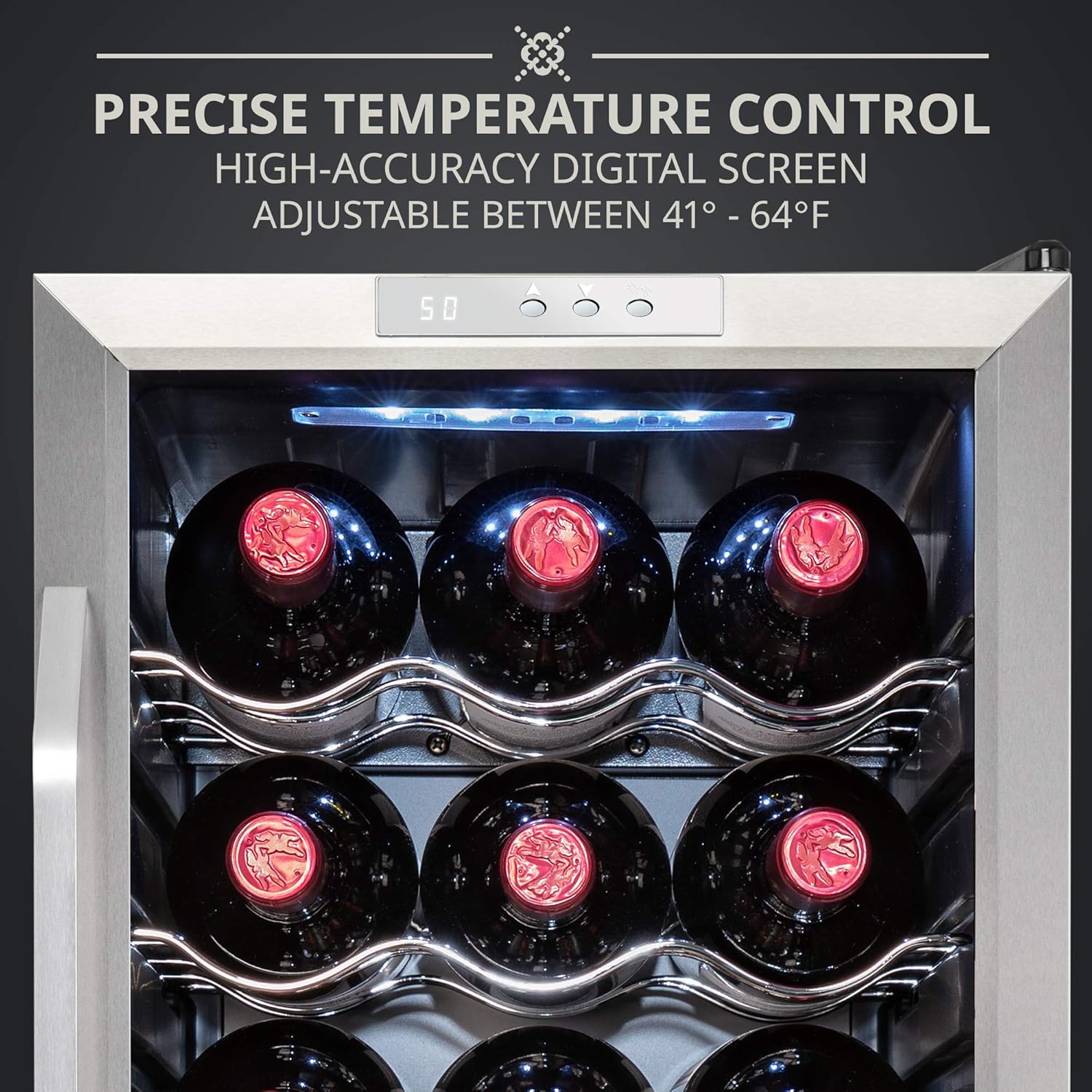 SOFT INTERIOR LIGHTING - Turn on the energy-efficient LED light to gently illuminate your collection. Say goodbye to harsh fluorescent bulbs that fade labels and affect flavor.