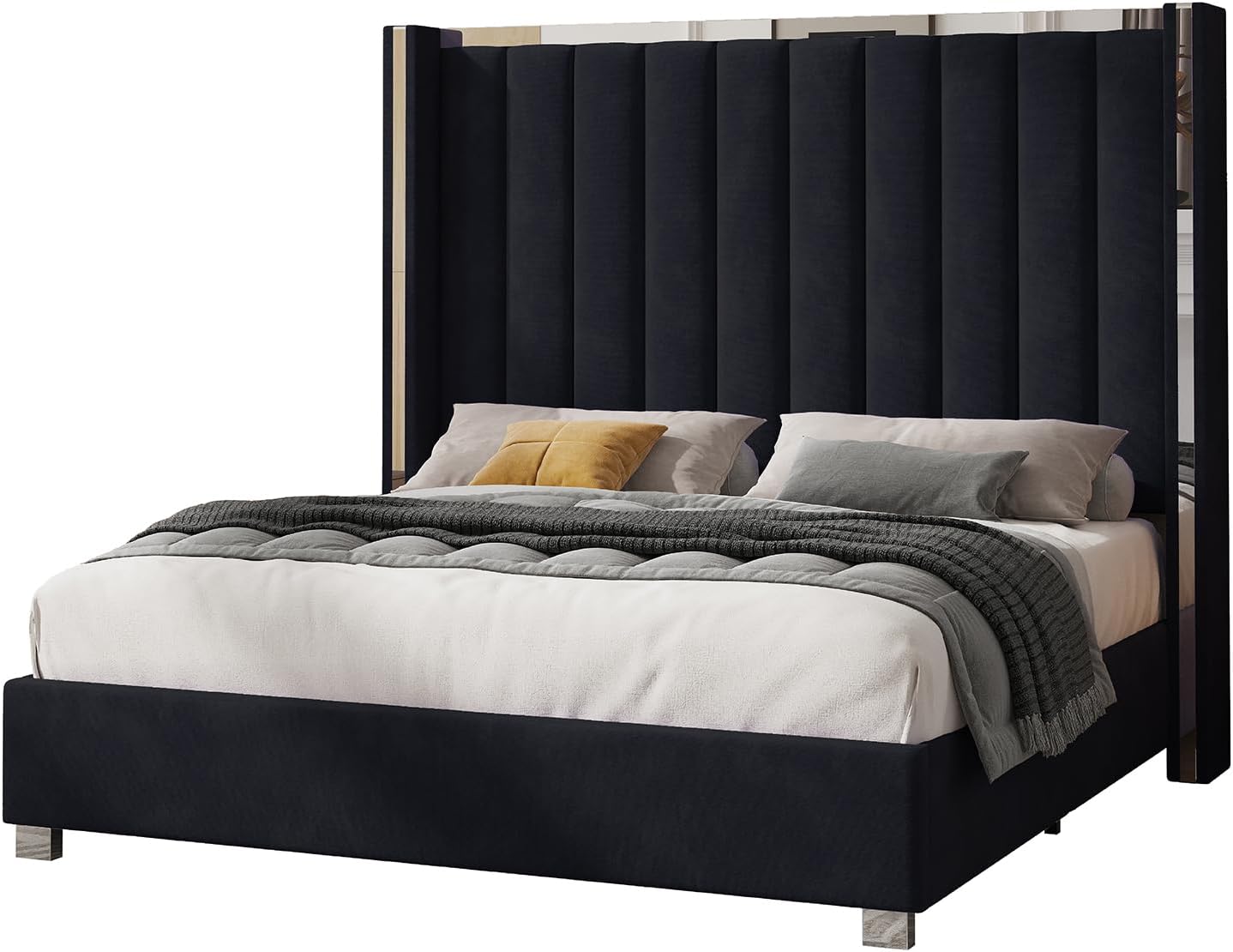 ELEGANT 58" HEADBOARD: Soft velvet upholstered bed with Channel Tufted Wingback Headboard, stylish galvanized strip trim and wingback design make it a standout piece.