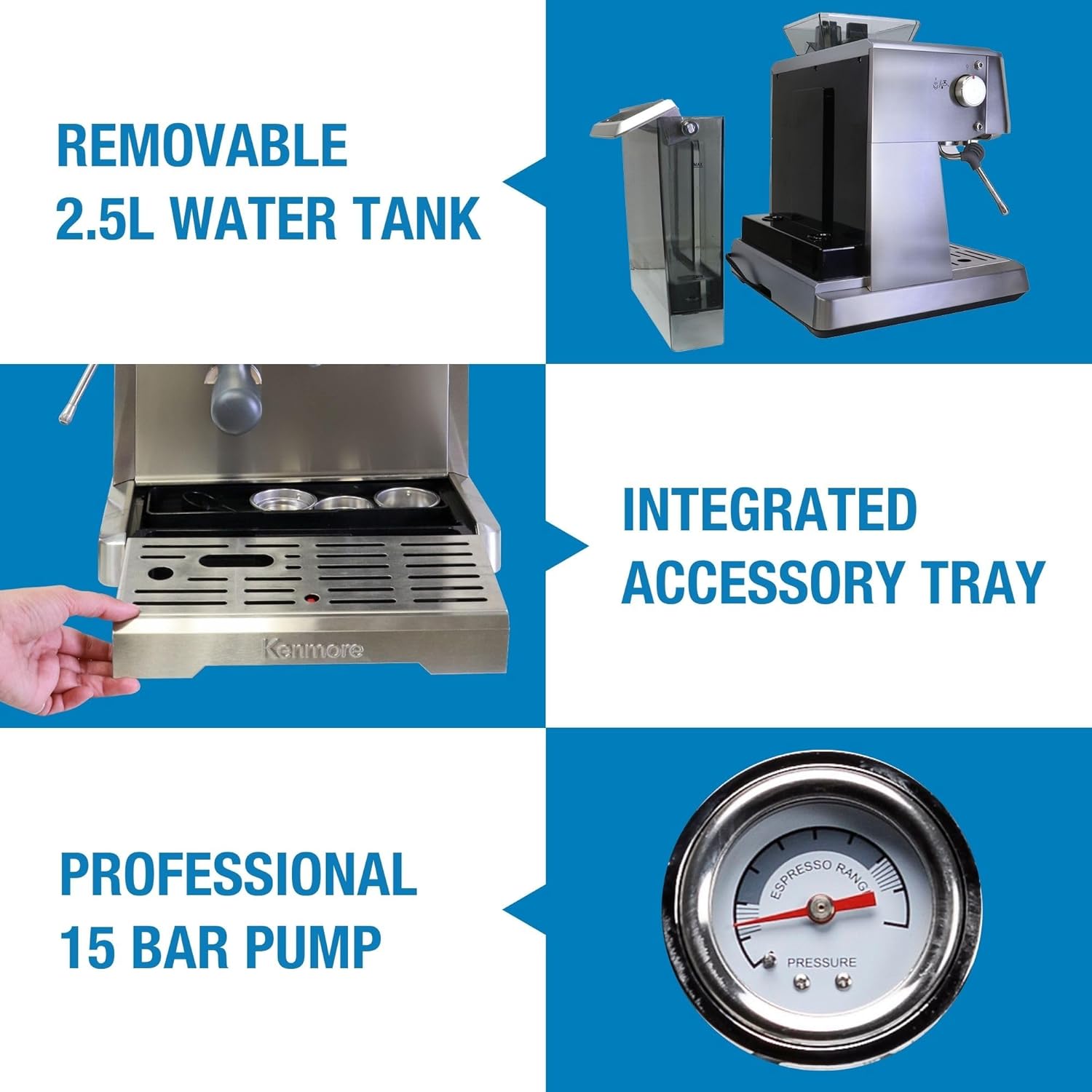 Kenmore's semi-automatic espresso maker lets you make coffeehouse-quality cappuccinos, lattes, and macchiatos in the comfort of your own home. All-in-one espresso maker comes with everything you need to get started right out of the box - just add coffee beans.