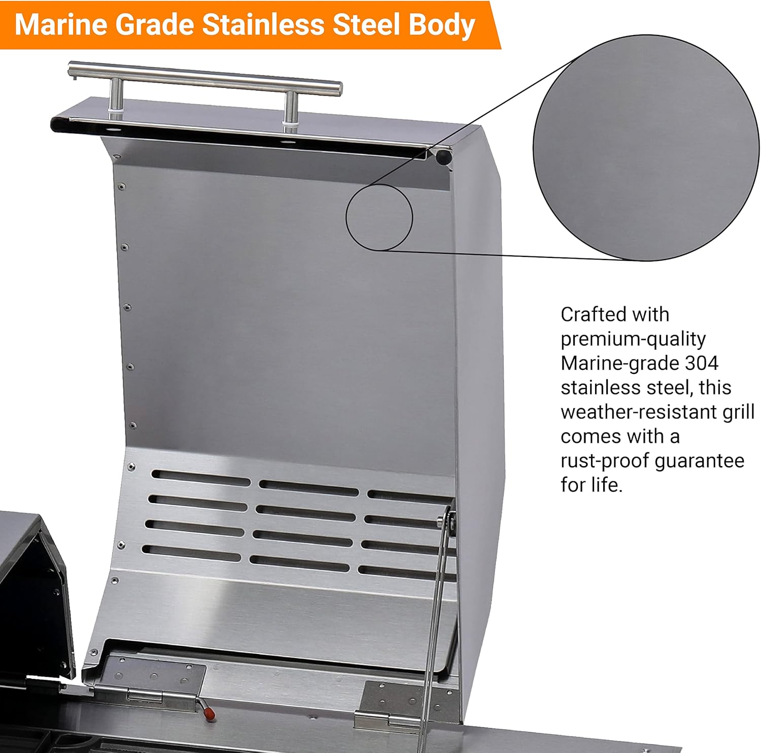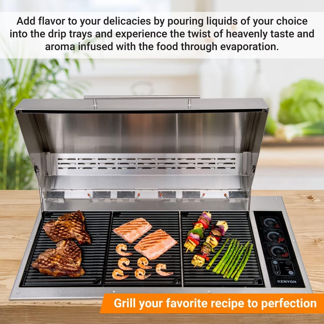 Stainless Steel Grill: This electric power grill is developed with premium-quality marine-grade stainless steel. It is weather-resistant and comes with a lifetime rust-proof guarantee. Upgraded coated drip trays are placed below the elements to trap drippings.