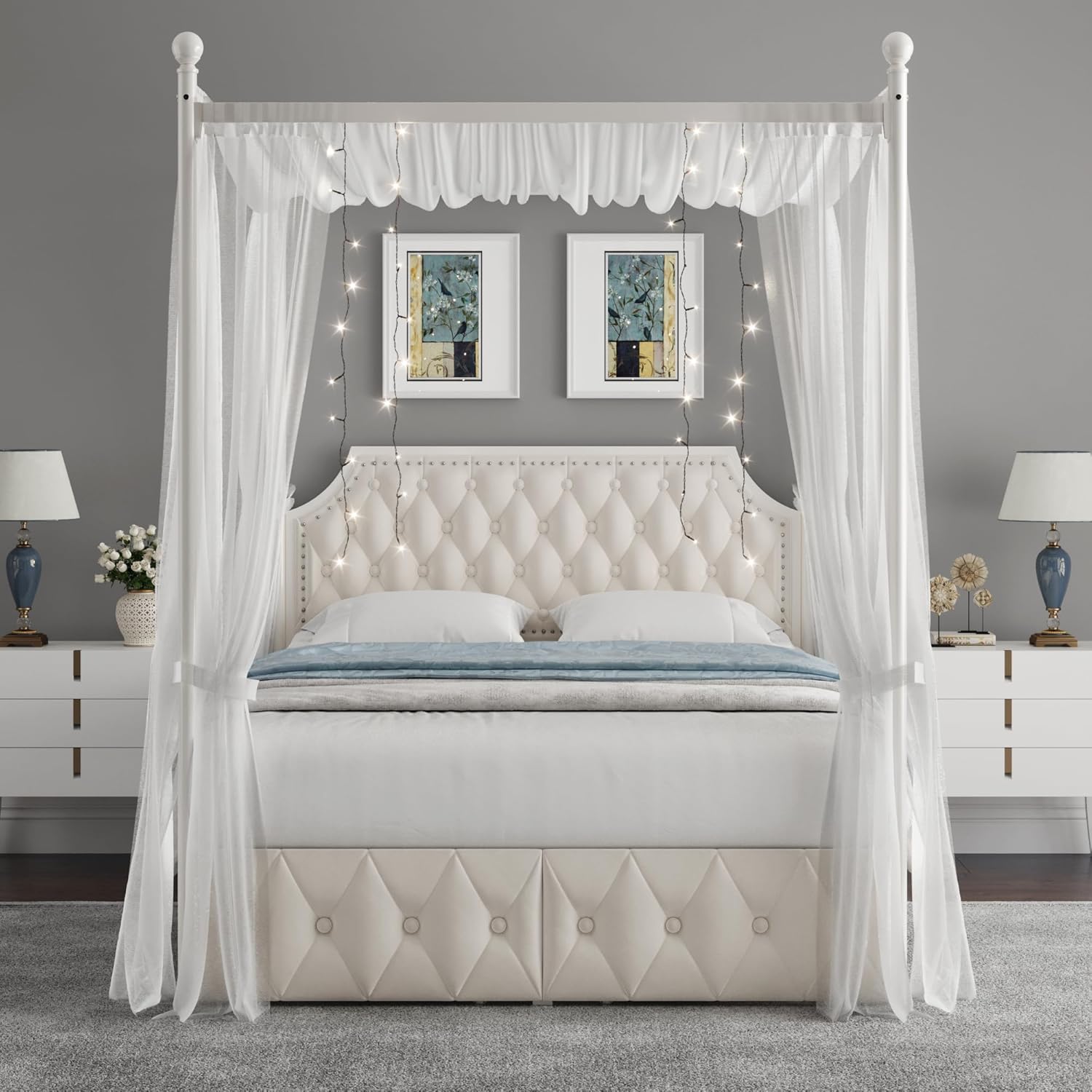 Two-Purpose Bed Frame: With a detachable canopy on the top, the platform bed frame can be quickly adjusted into a four-poster canopy bed. The unique design meets your needs and creates a dreamy atmosphere for the bedroom.