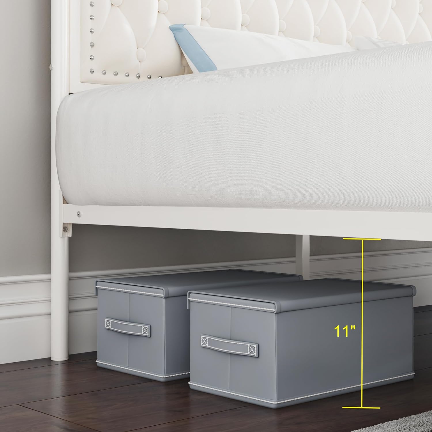 2 Large Storage Drawers: The 2 drawers in front of the queen bed frame with headboard can be used to place clothes and toys to meet storage needs. The 11-inch clearance under the bed allows the robot vacuum to enter and exit freely and provides additional storage space, and the air circulation keeps the mattress fresher for longer.