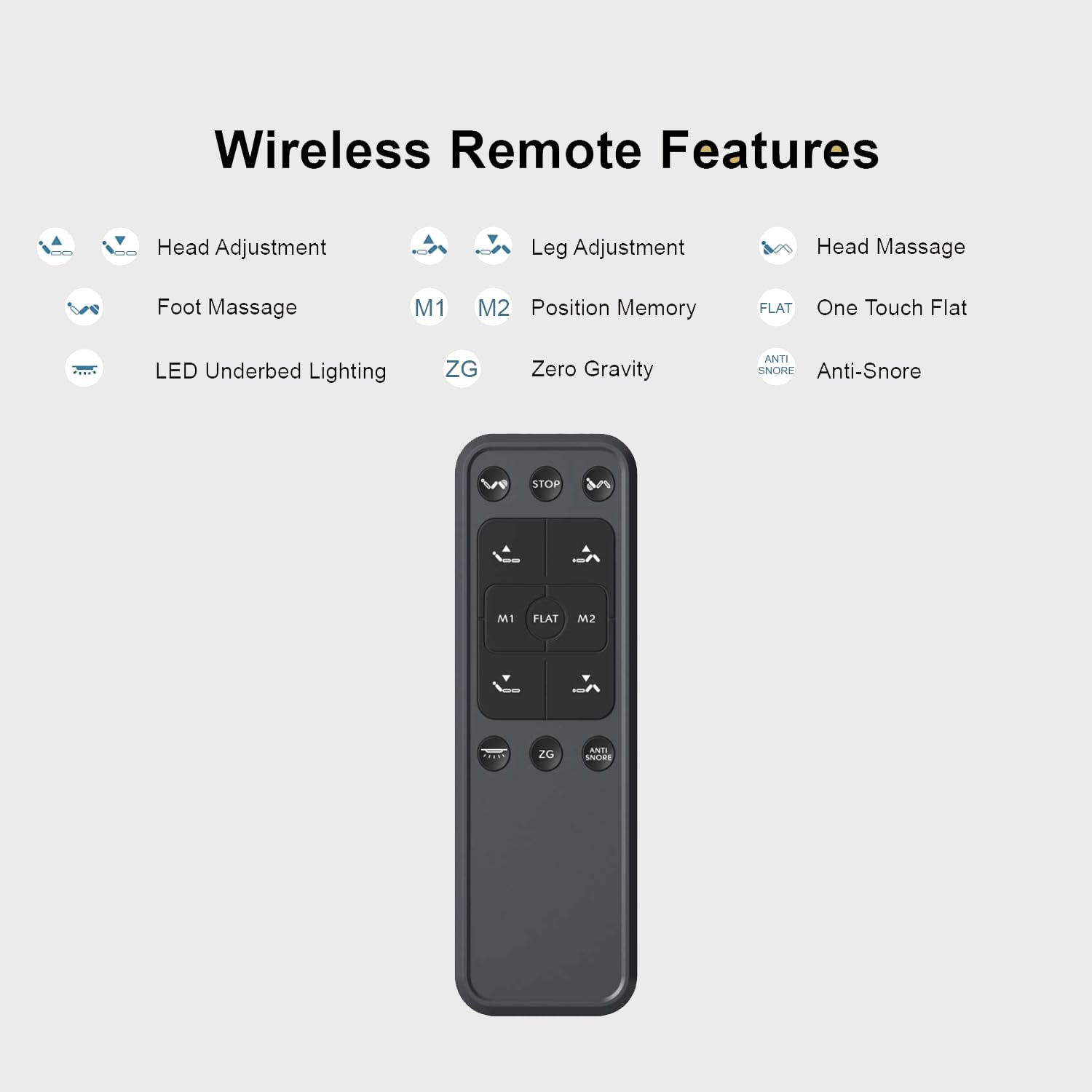 EASY TO USE REMOTE Intuitive remote control with preset positions like Zero Gravity and Anti-Snore, plus programmable memory settings so you can save and access your favorite positions with ease.