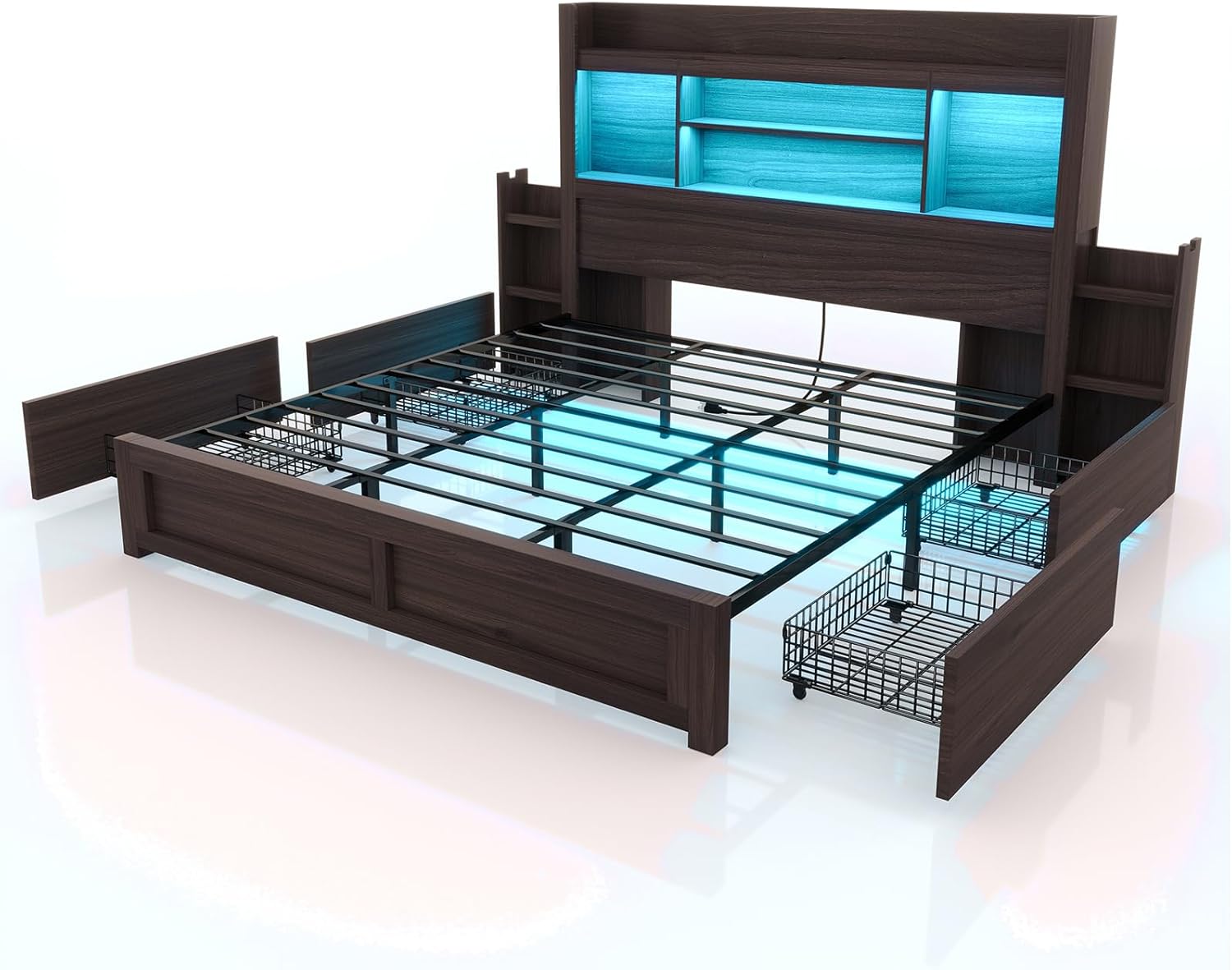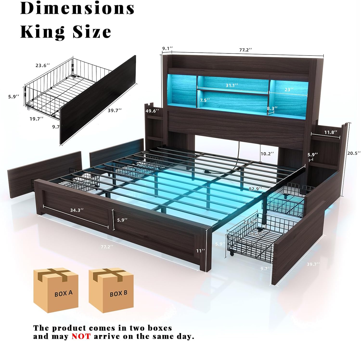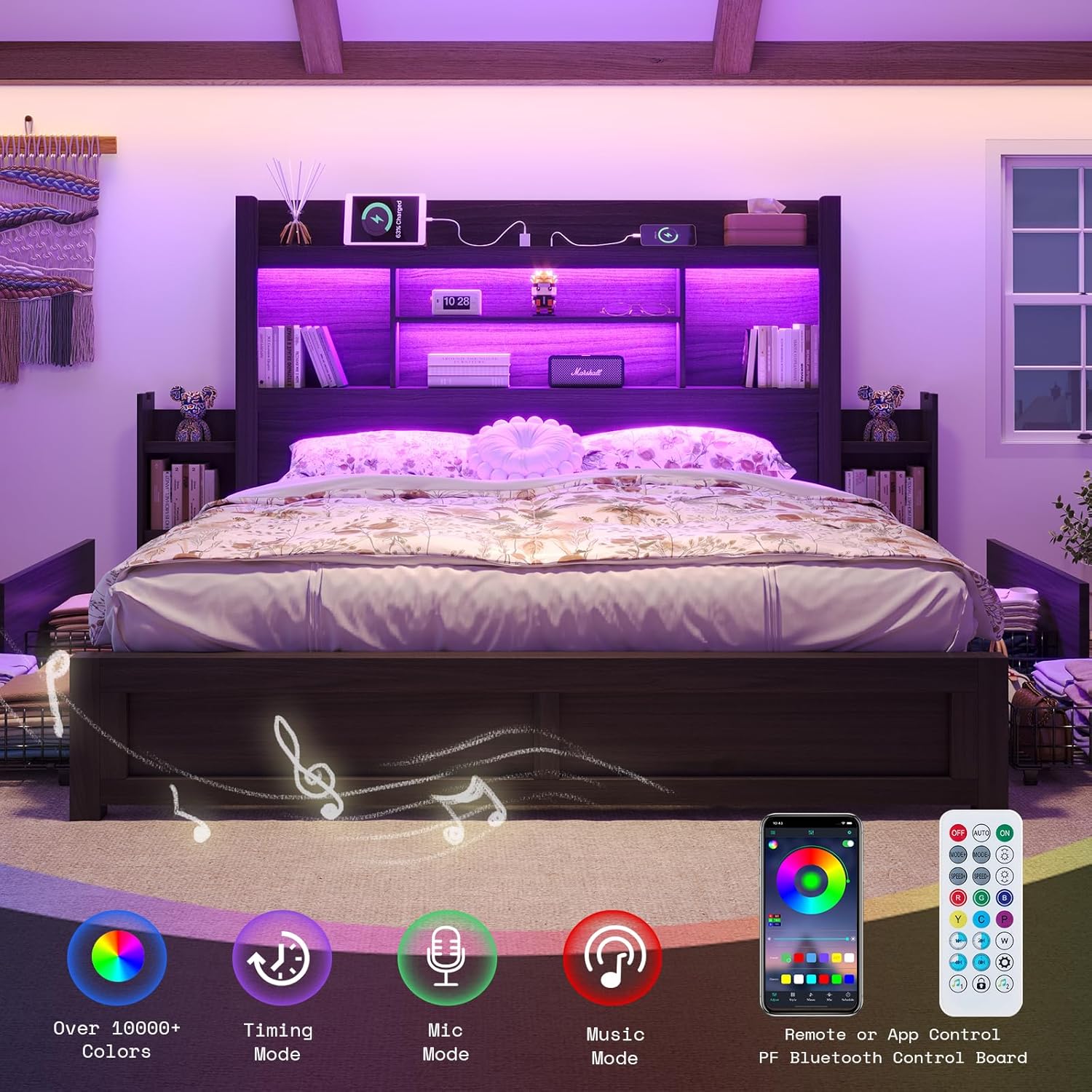 Elegant Wood Grain & RGB LEDBed Frame features panel-style design with no exposed metal, complemented by a sophisticated wood grain and RGB LED lights can be controlled via a remote or App, offering 1000+ color options for customizable ambiance.