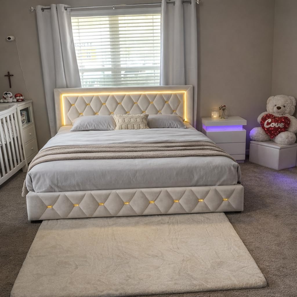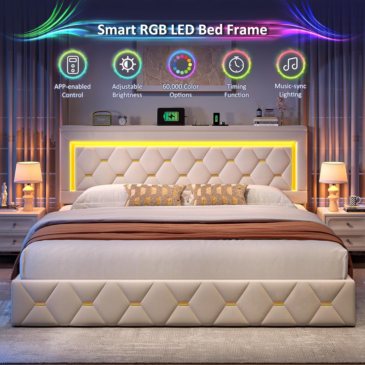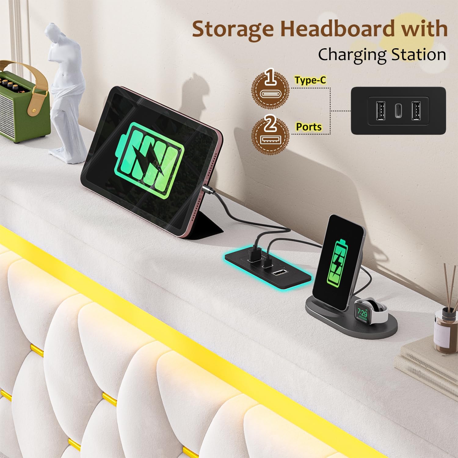 LED Bed Frame with Charging StationKing size bed frame with ambient LED lighting for nightlight or mood settings. Features built-in headboard charging station for wireless powereasily charge phones and earbuds right from bed.