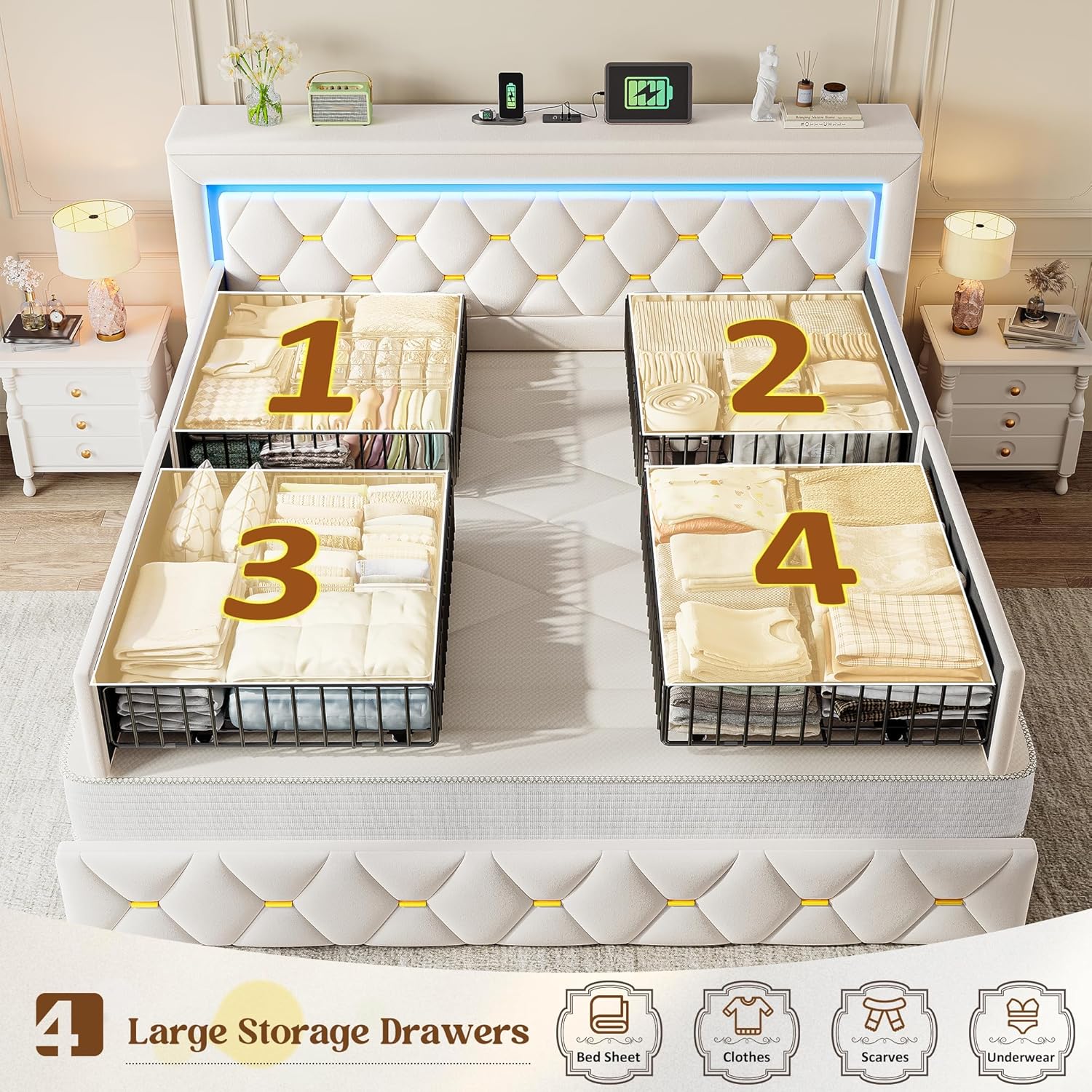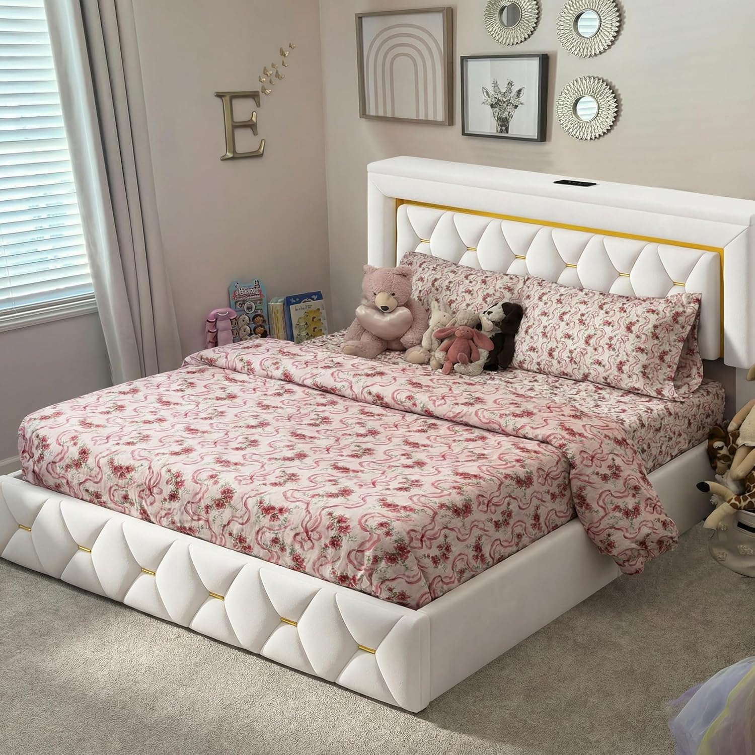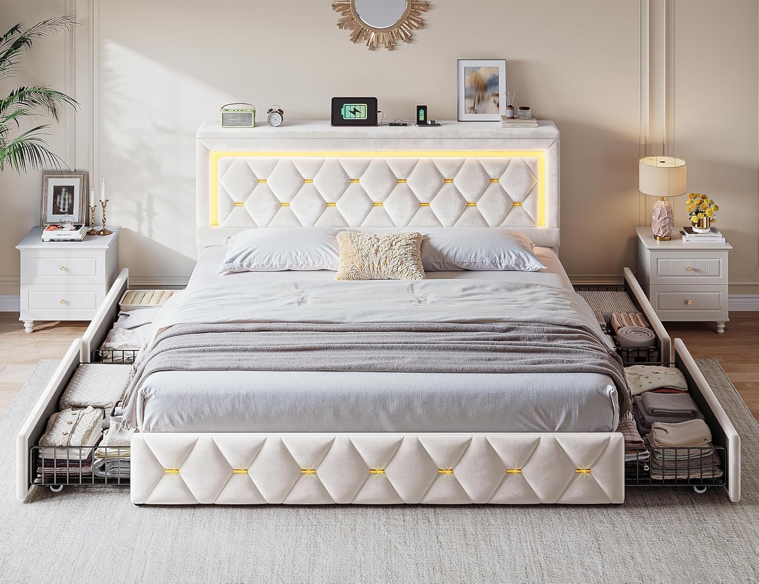 LED Bed Frame with Charging StationKing size bed frame with ambient LED lighting for nightlight or mood settings. Features built-in headboard charging station for wireless powereasily charge phones and earbuds right from bed.
