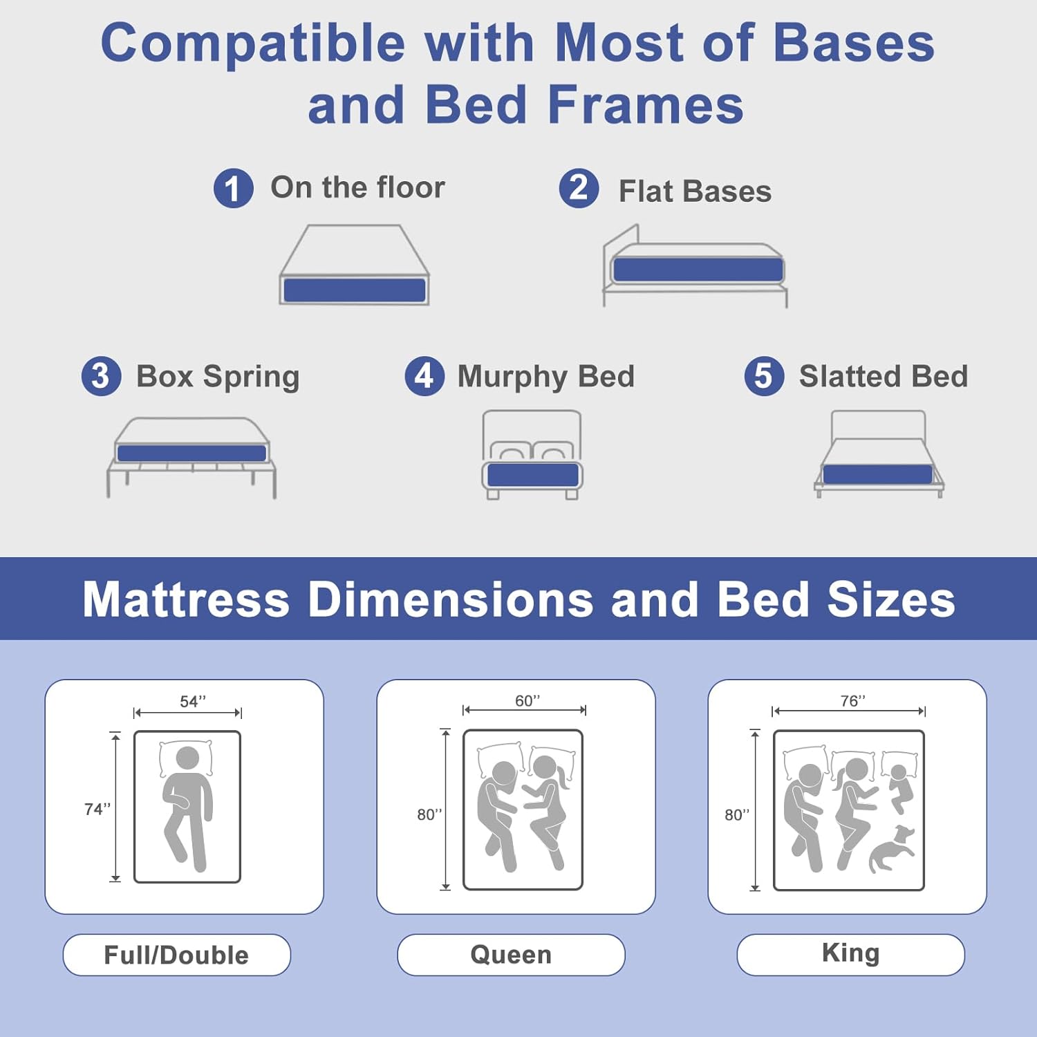 Convenient "Bed-in-a-Box": Your firm king mattress arrives compressed in a box for easy setup. Simply unbox, unroll, and allow 72 hours for full expansion to its optimal 14 inch height. It's compatible with most bed frames, box springs, slatted bases, or platform beds, offering hassle-free durability