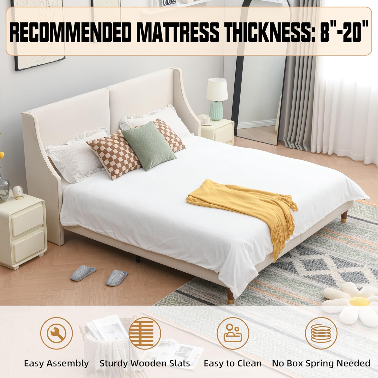 No Box Spring Needed: As an linen king bed frame with wingback headboard, it requires no box spring; This saves you money, time and effort, making it a convenient and economical choice for your bedroom setup