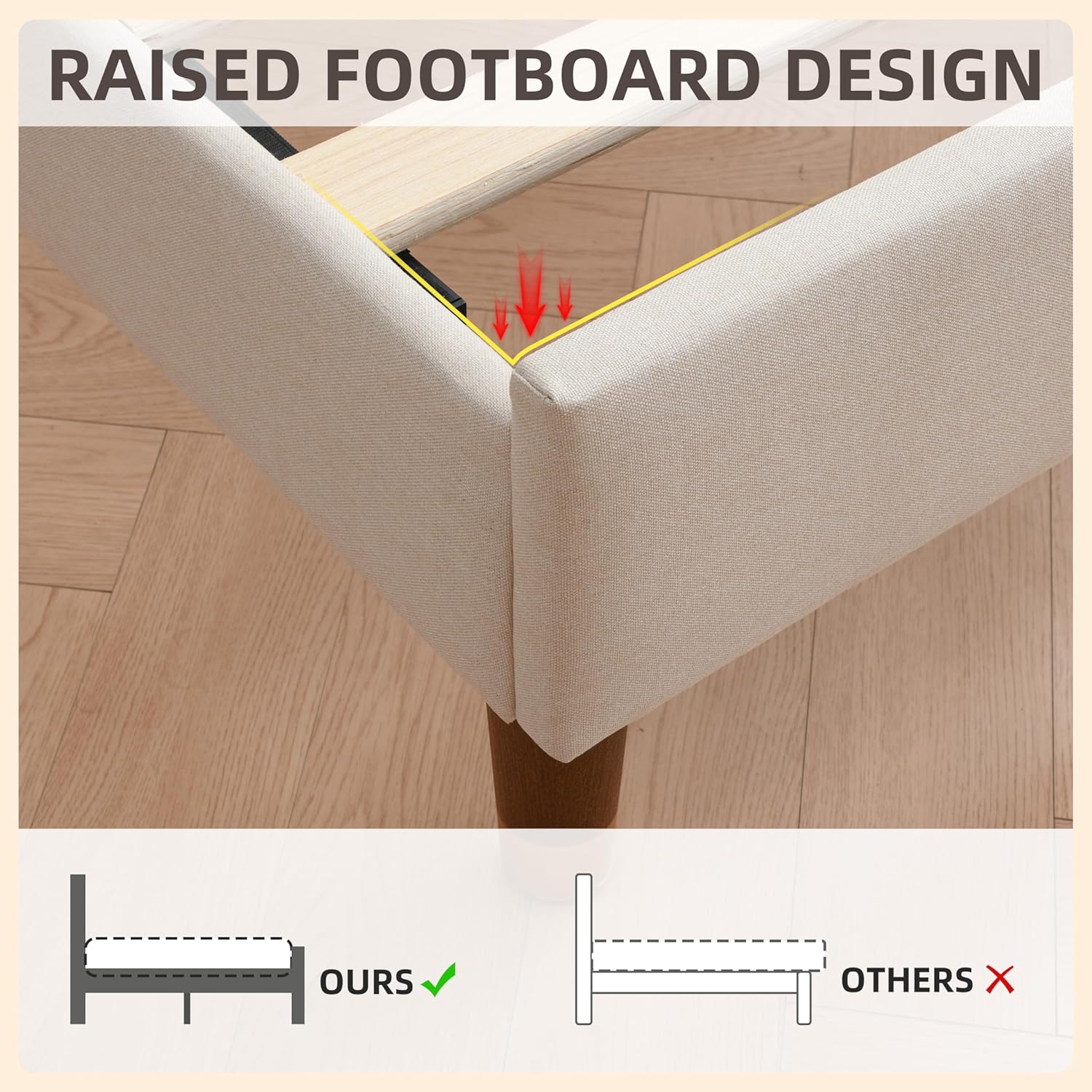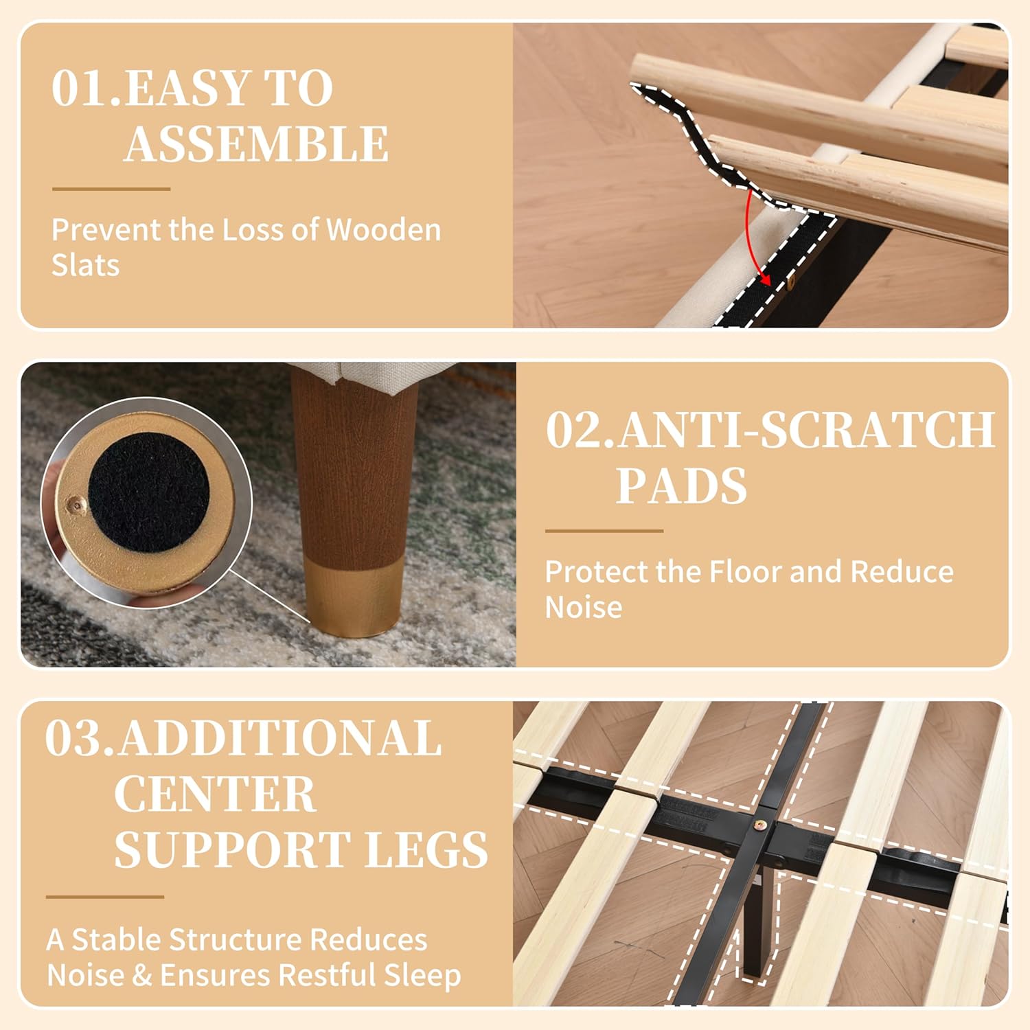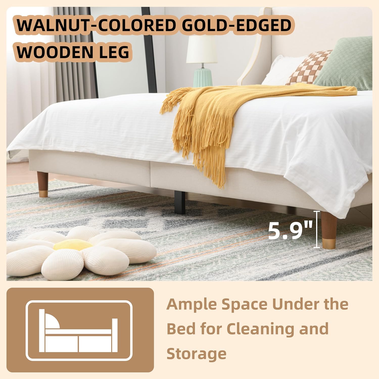Exquisite Bed Feet Craftsmanship: The king bed frame's bed legs designed by a British designer with 30 years of experience, they feature a walnut color and gold - plated plastic; The anti - scratch pads on the bottom ensure no damage to your floors, adding a sophisticated touch to your bedroom