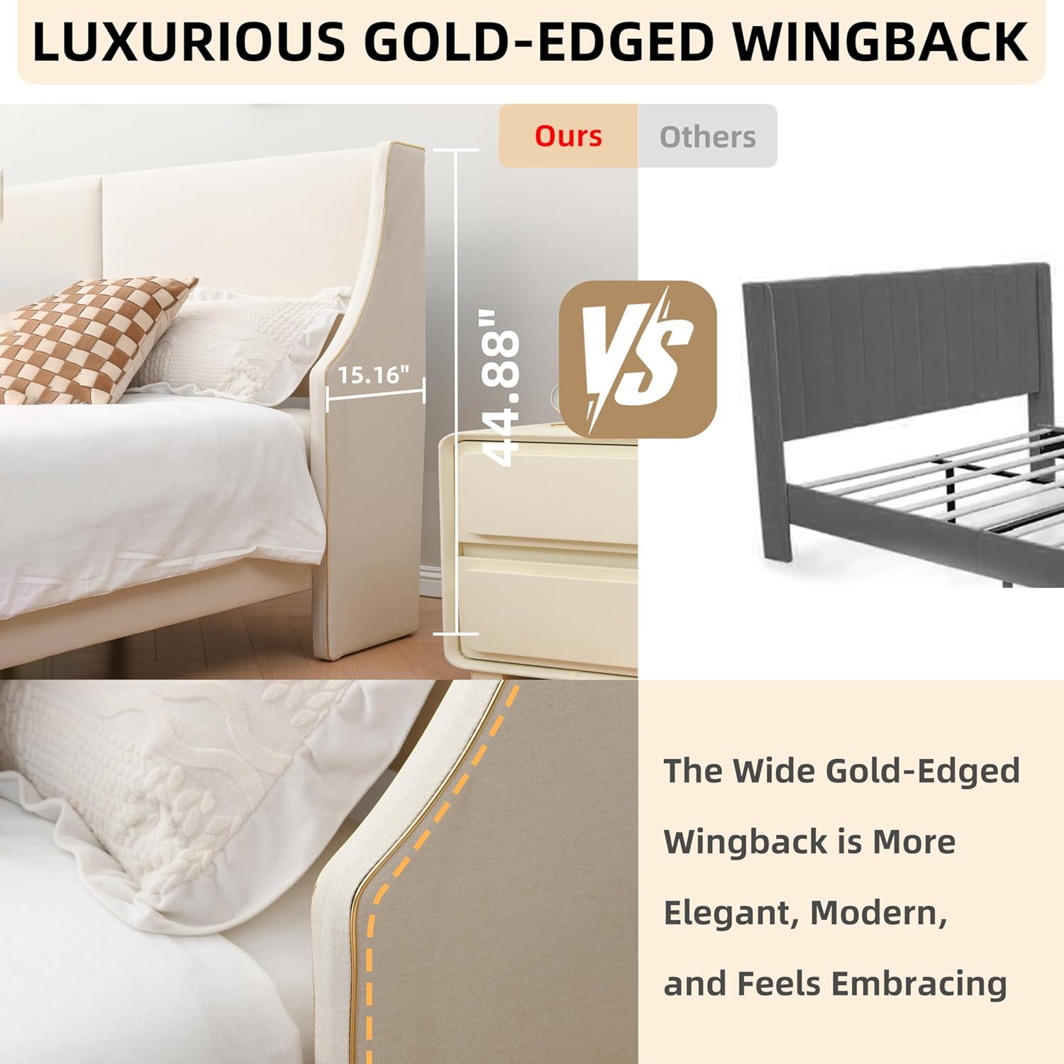 WHY CHOOSE ? This bed's gold-edged wingback design exudes luxury and grandeur; With top - quality materials and a robust structure, it's definitely worth the investment; You can also visit our store, which offers a wide range of bedroom furniture; If you have any questions, feel free to contact us at any time