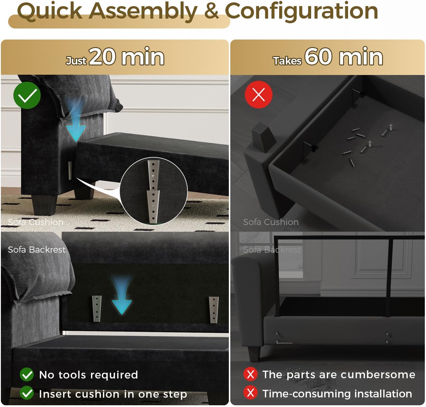 Easy to Assemble: The couches for living room features a quick-insert design, allowing assembly in just 20-30 minutes without the need for bolts or screws, making setup simple and stress-free
