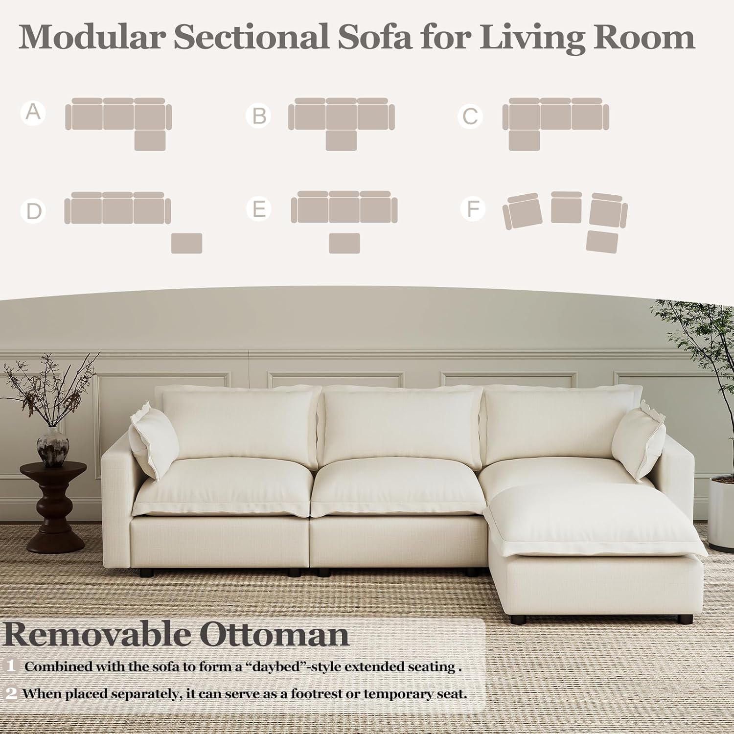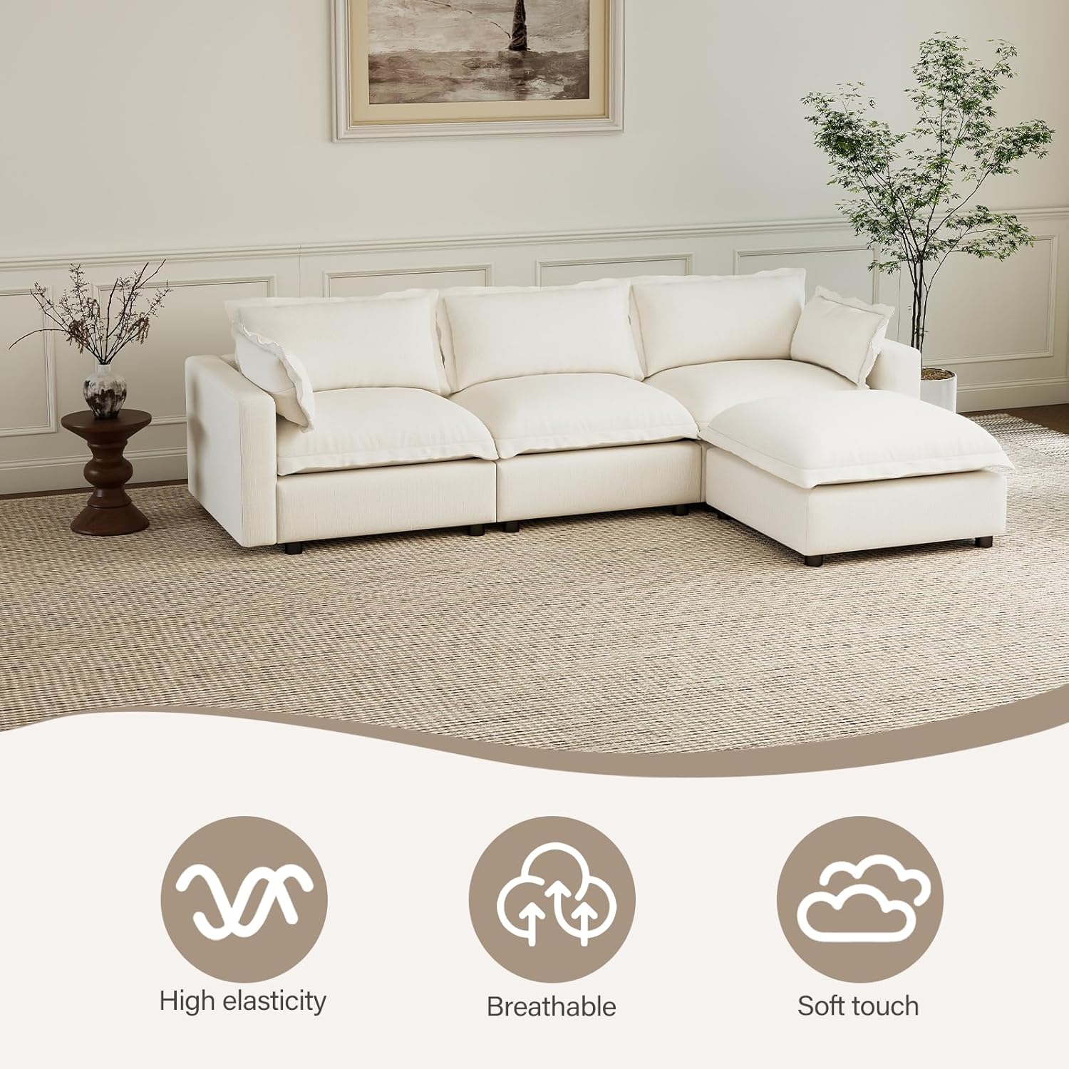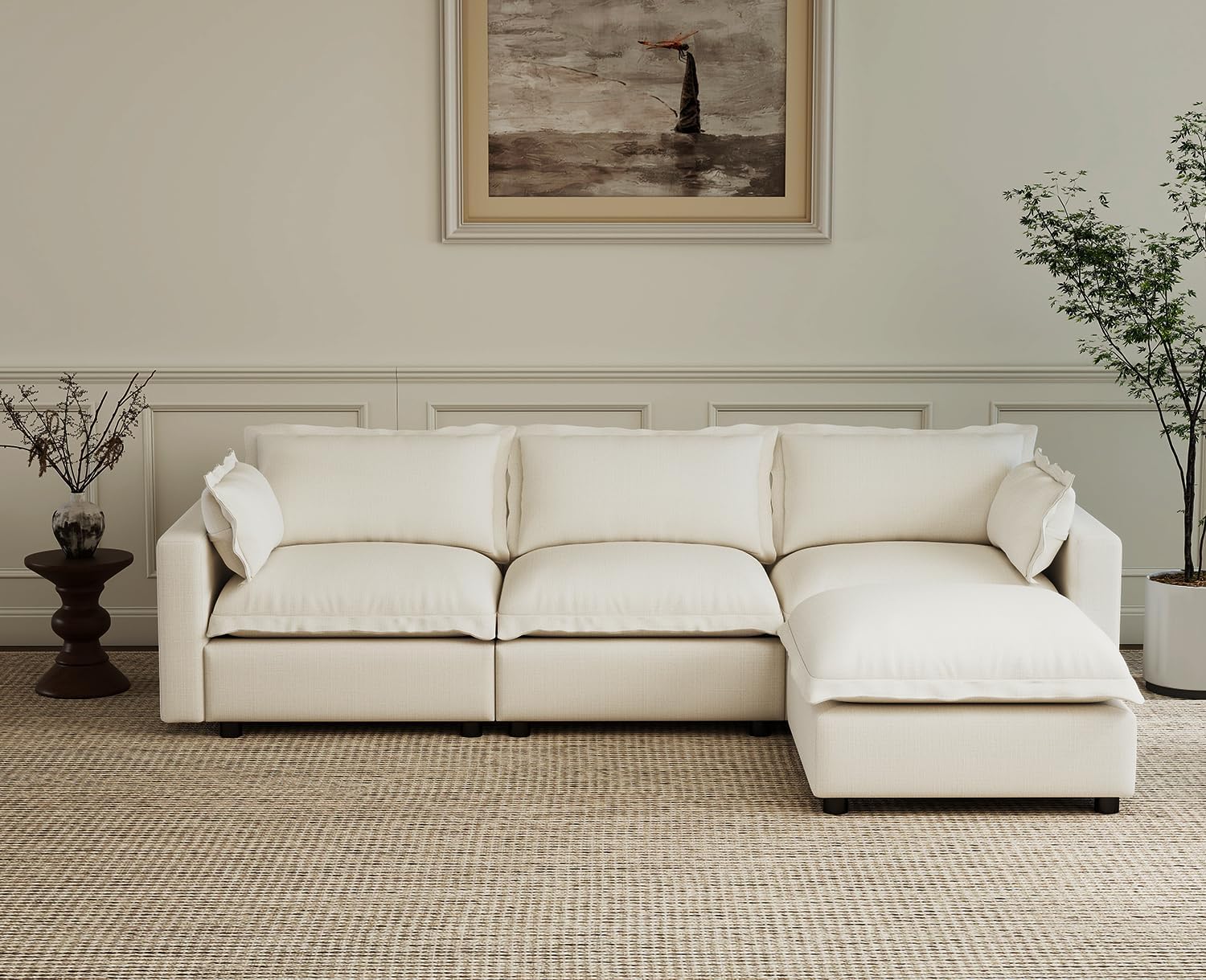 Oversized SofaThe Cloud Couch features a seat width of 30" and a seat depth of 23", along with a 30" wide ottoman. The entire L-shaped sofa measures 97" in length. Whether you are sitting or lying down, it provides you with ample rest space and a comfortable seating experience