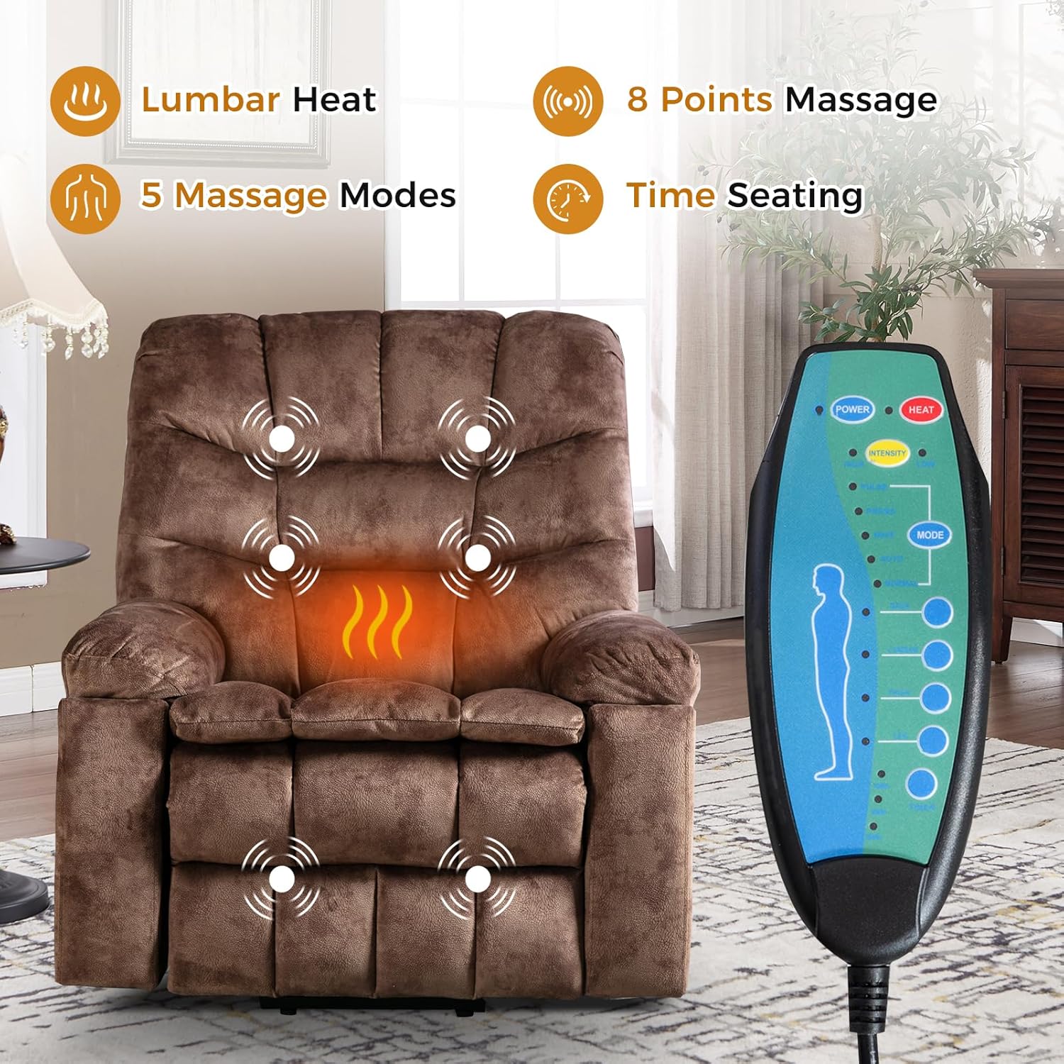 8-Point Massage & Lumbar Heating: This electric recliner features an 8-point massage system with two different vibration intensities and five modes, focusing on the upper back, lumbar, and thighs for a soothing experience. The built-in lumbar heating helps ease tension and improve circulation, offering comfort and relief where it's needed most.