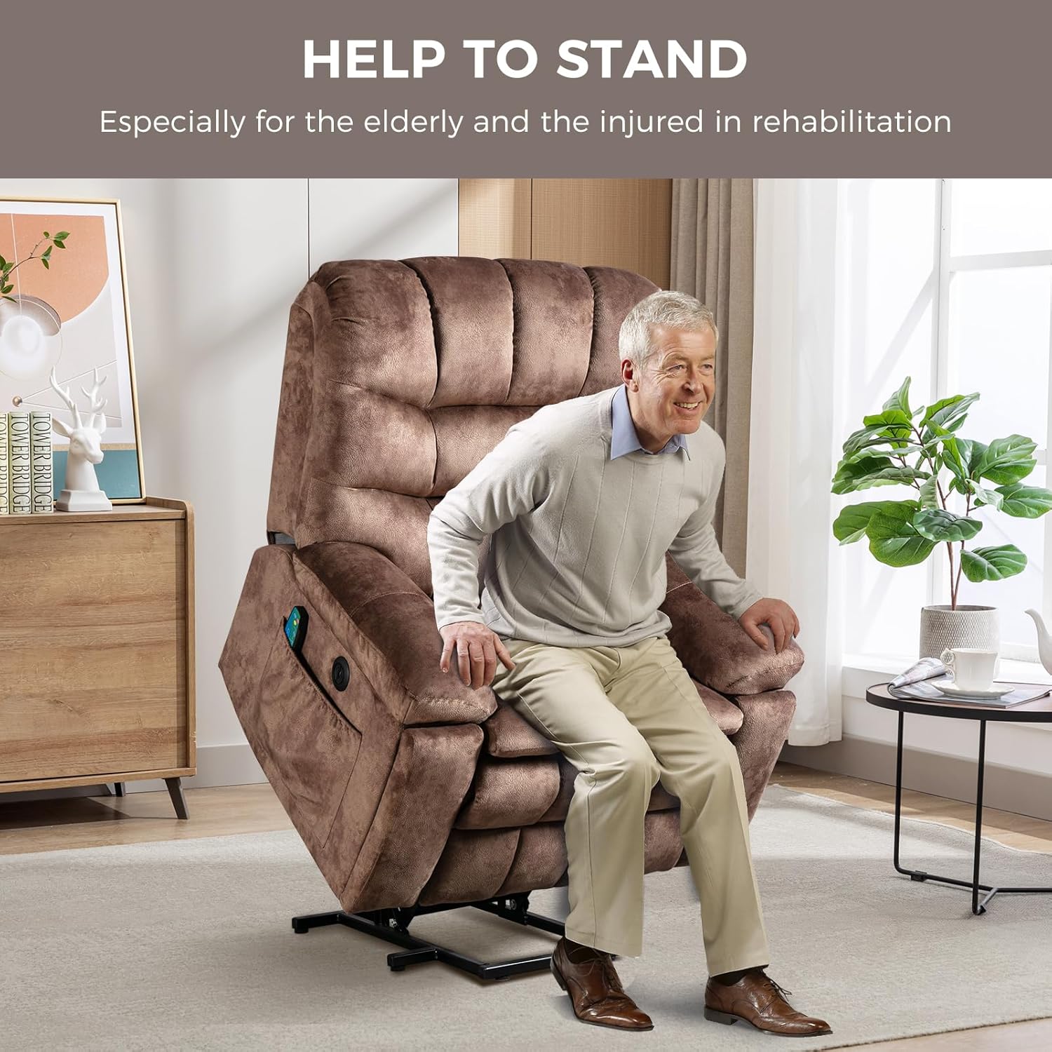 Power Lift Chair with Safety Motor: Designed with seniors in mind, this power lift recliner gently tilts forward to assist in standing without straining knees or back. A simple button control allows smooth adjustment to any positionfrom slight recline to full liftcombining safety, support, and ease of use.