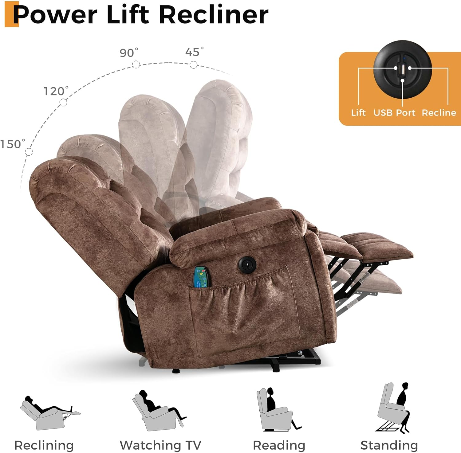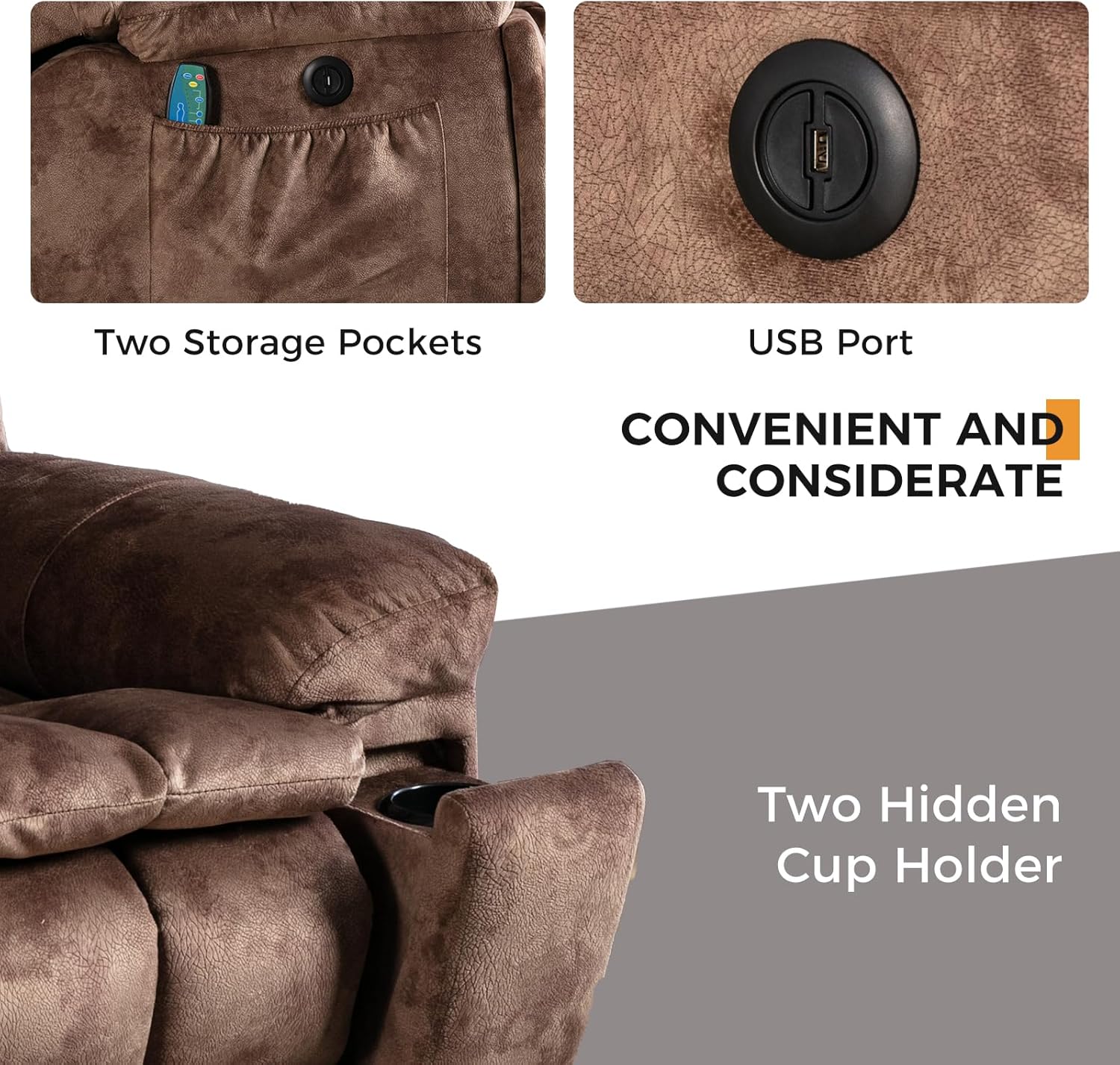 USB Charging Ports & Concealed Cup Holders: Stay connected and refreshed with built-in USB ports (for low-power devices only) and two Hidden Cup holders. Side pockets keep remotes or reading glasses within easy reach, offering thoughtful convenience throughout the day.