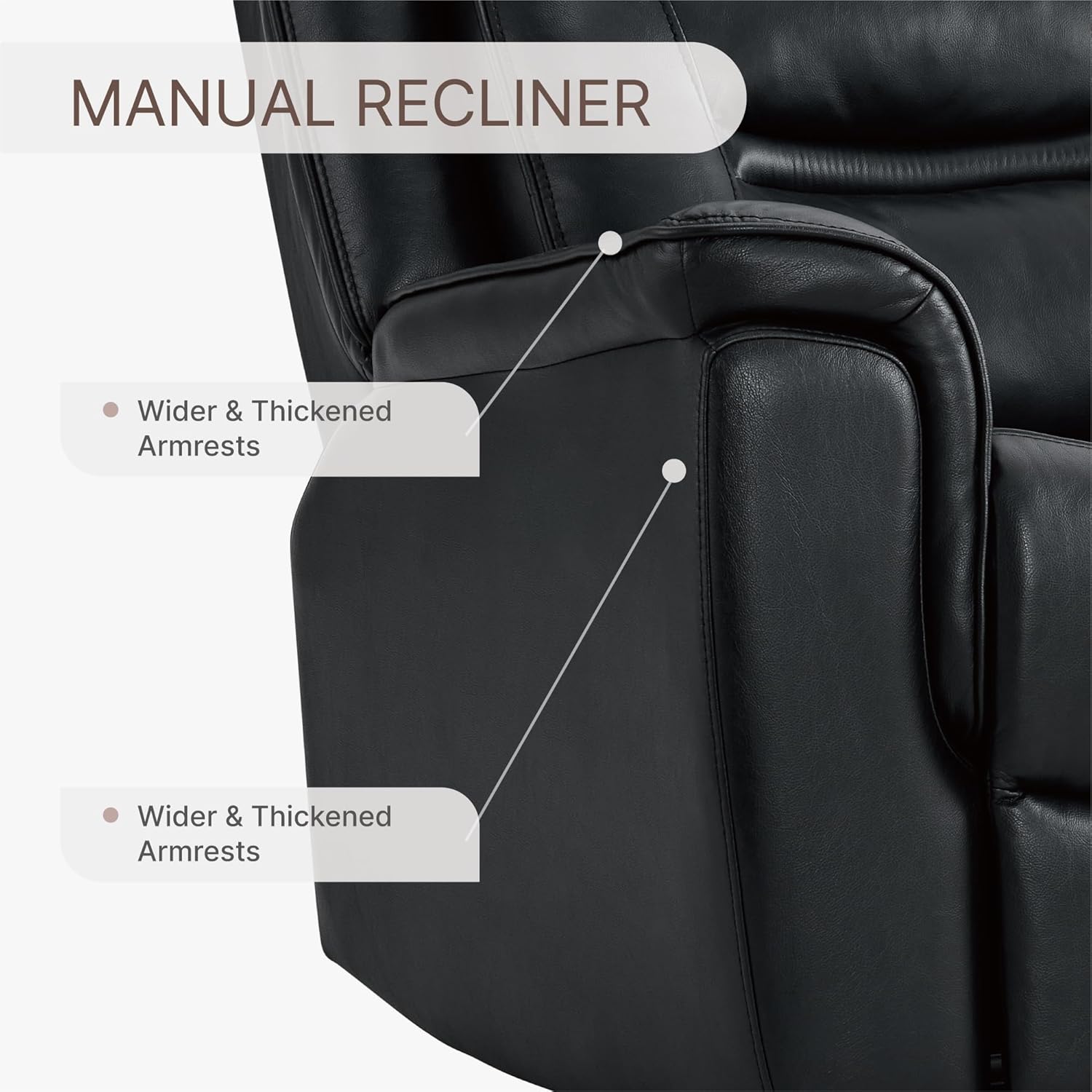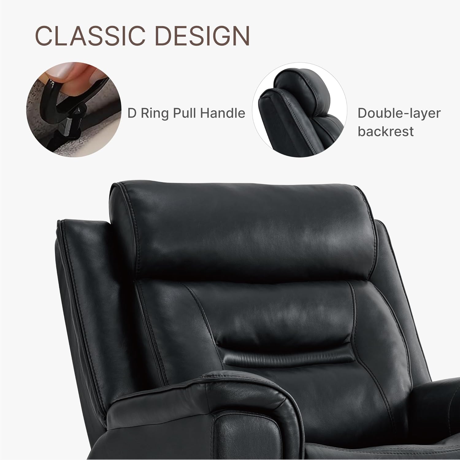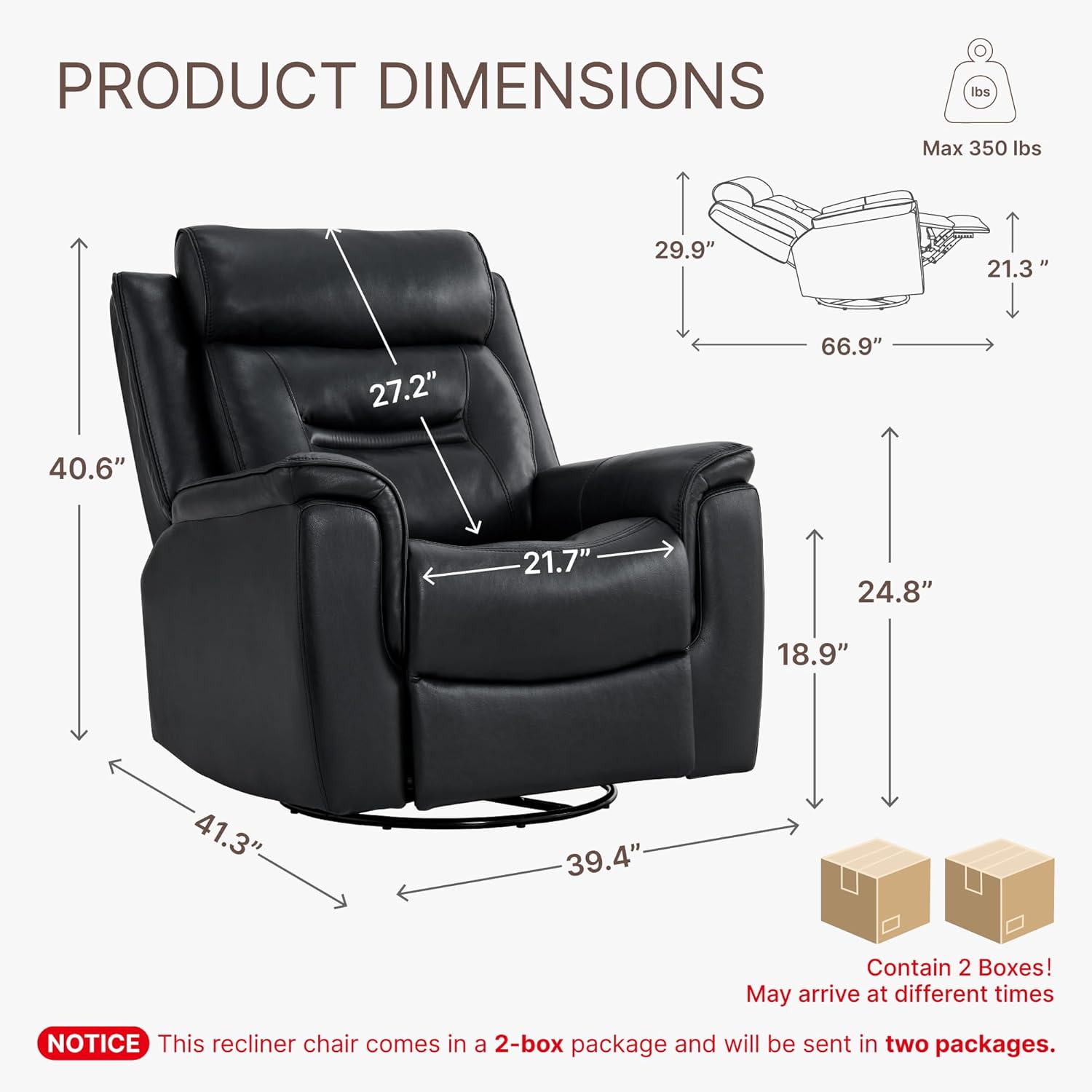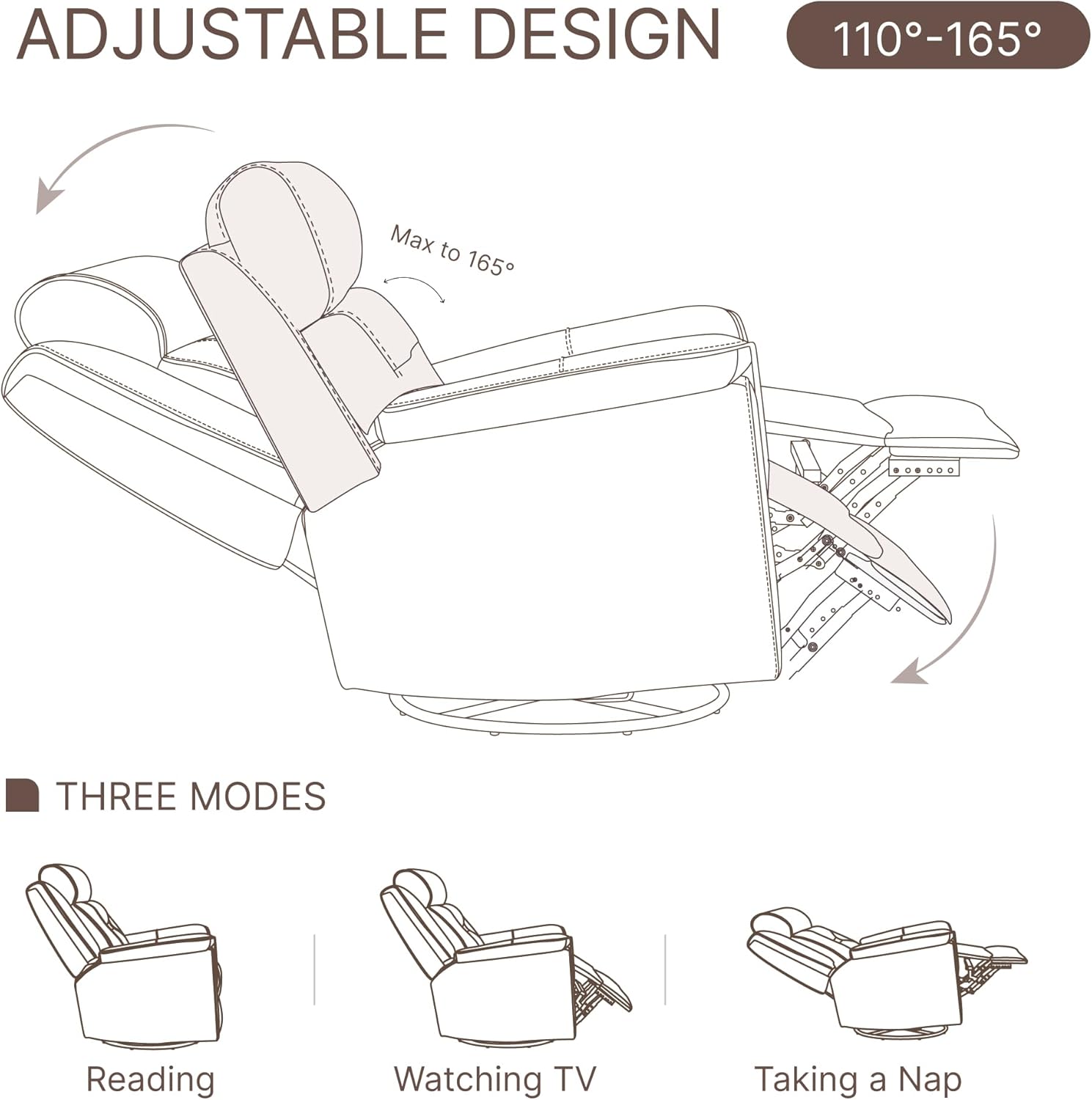 SWIVEL & GLIDERThe leather recliner chair is designed with your comfort in mind.The bottom is equipped with a swivel metal base, makes the rocking experience smoother and more stable.The smooth gliding and swivel function can provide better relaxation for your family.