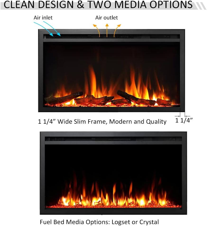 MULTI FLAME COMBINATIONS: The modern and realistic flame creates a life-like flame feel; Including both options for fuel bed: Log set and crystal stone. Multi color flame and fuel bed in 5 brightness settings, crackling sounds to suit your different moods cheerful or peaceful in different occasions. Flame and crackling effect can be used with or without heat.