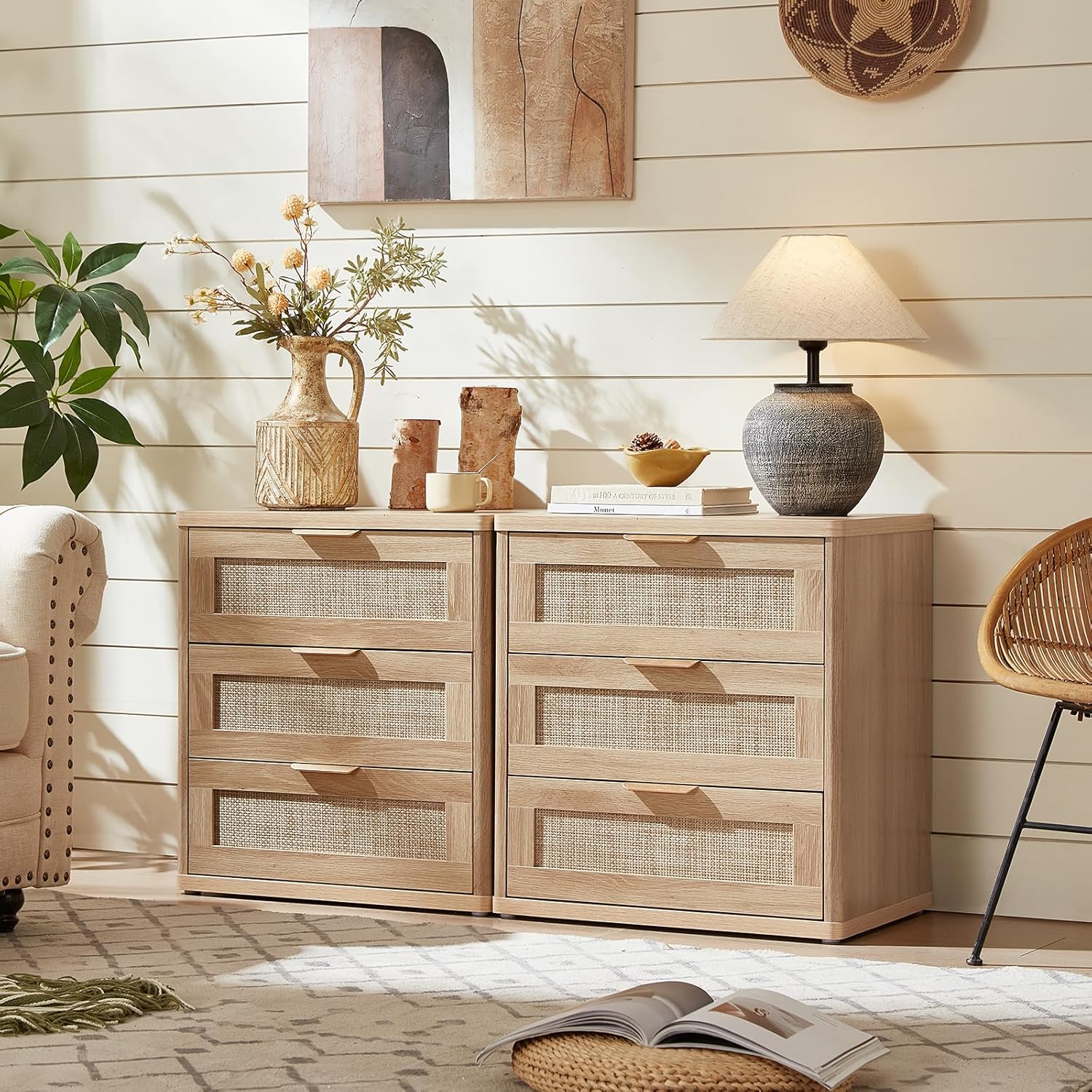 Durable and Sturdy: Our bedroom set is made of high-quality wood, which is durable and long-lasting. The desktop is up to 1 inch thick and has strong load-bearing capacity, while the circular edges of the rattan dresser help prevent collisions. Smooth metal slides and handles ensure easy and effortless drawer operation.