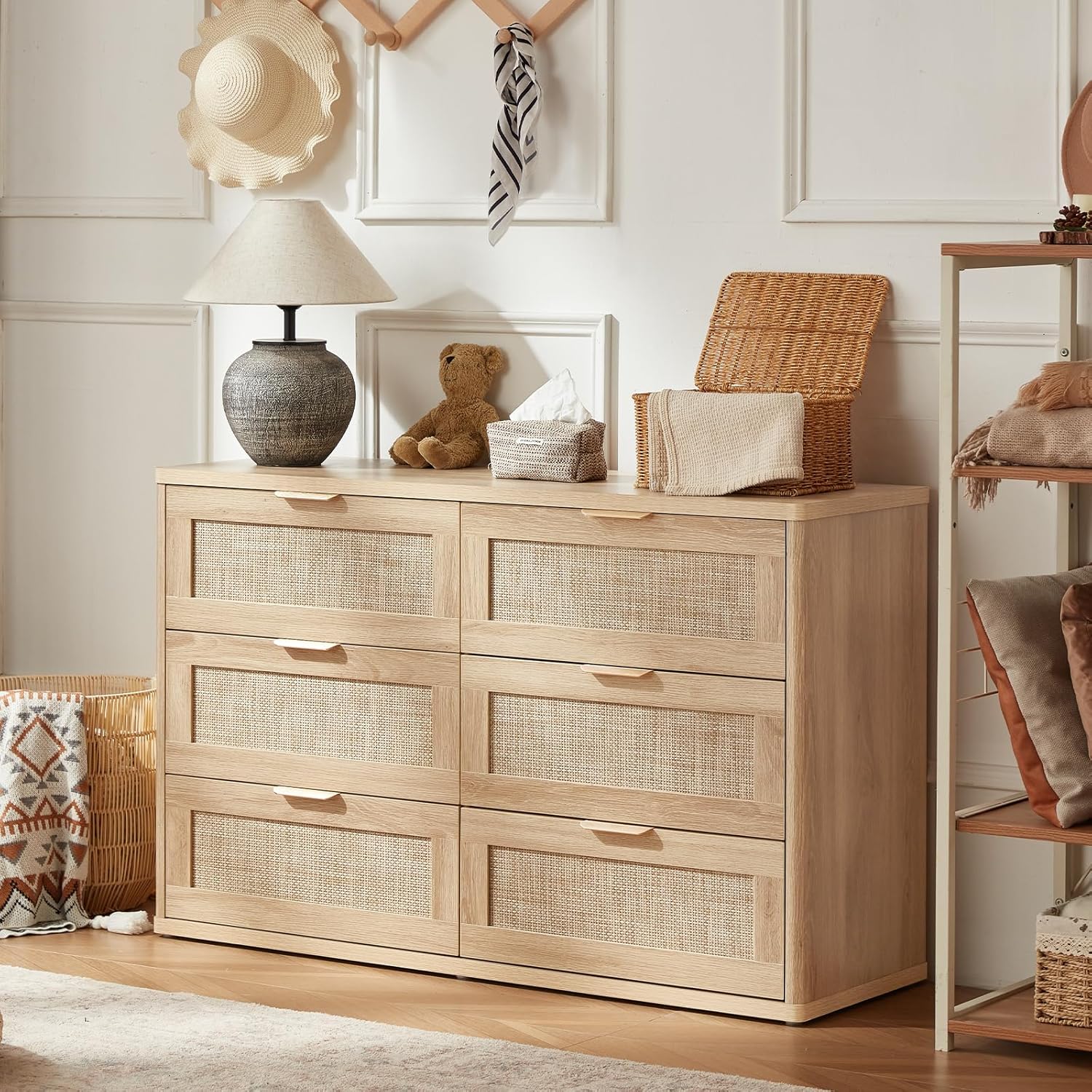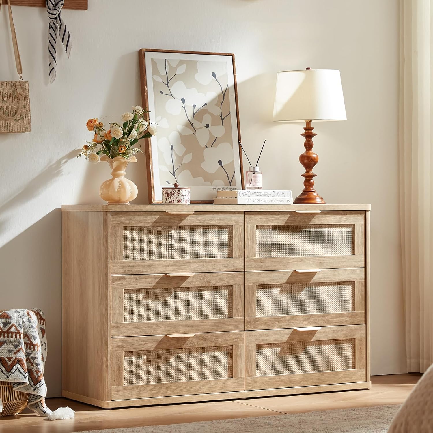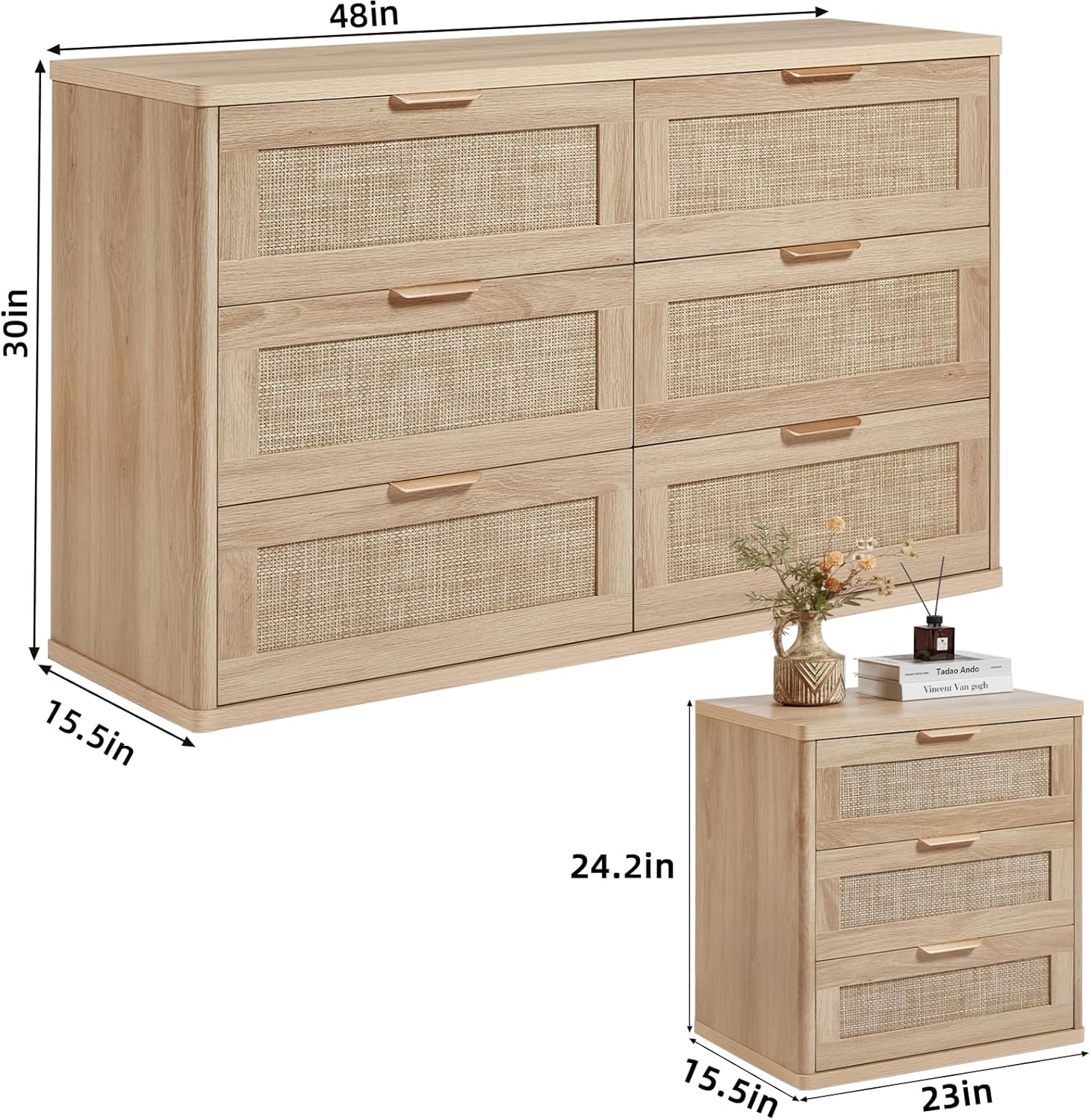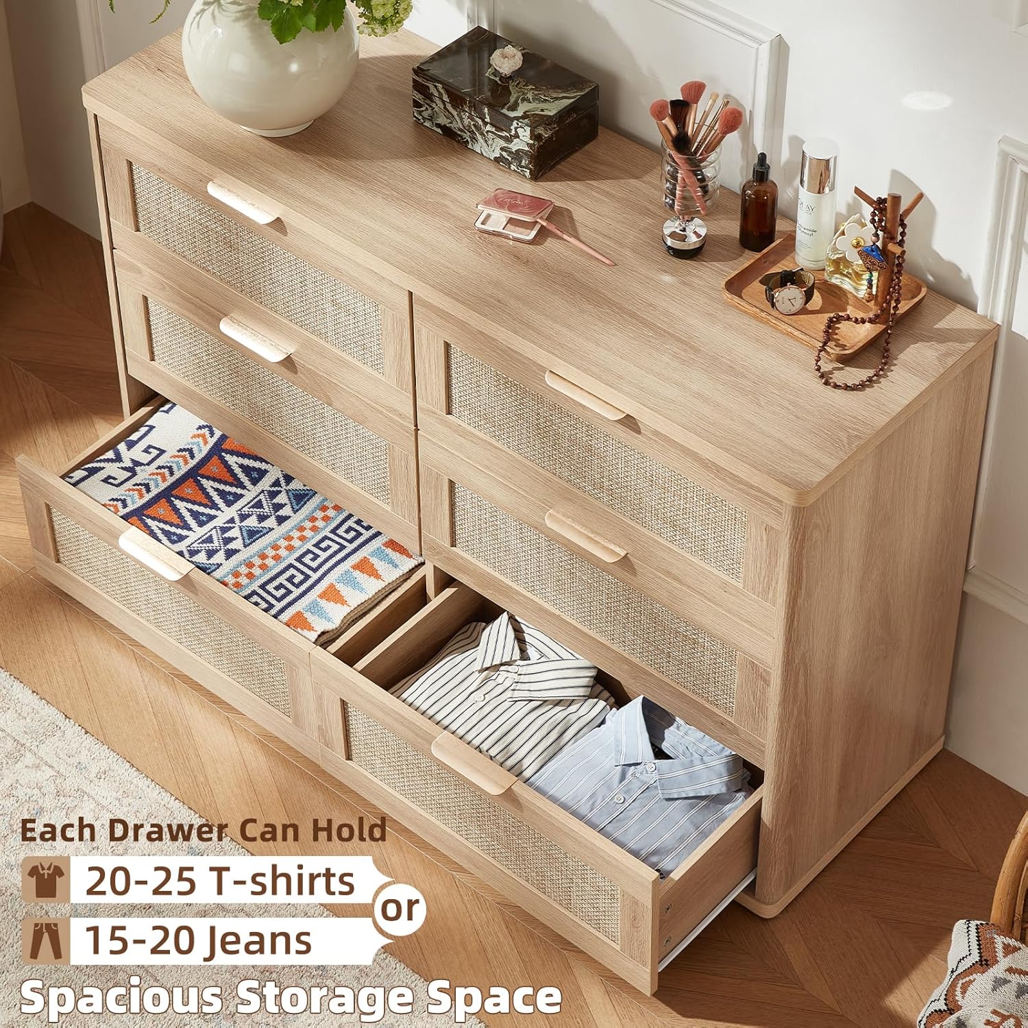6 Drawers Dresser for Bedroom: This dressing table, with its appropriate size (48 "L x 15.5" W x 30 "H), is not only suitable for bedroom use, but can also be used for foyer storage or living room decoration. The dressers is equipped with 6 large drawers, designed specifically for storing cosmetics, daily necessities, and other items, helping you keep your space tidy and orderly. The same rattan noodle series set complements each other perfectly, bringing convenience and beauty to your home.