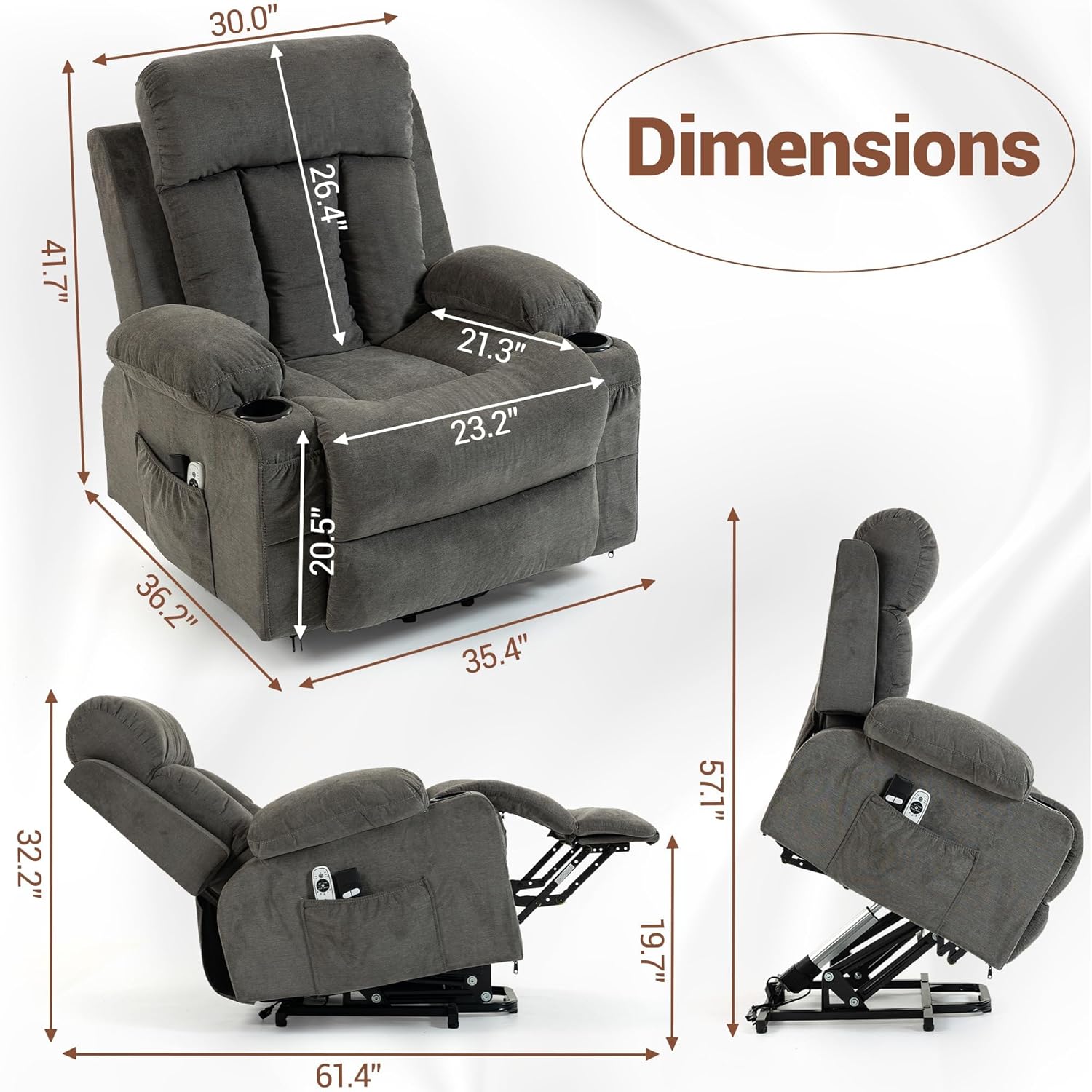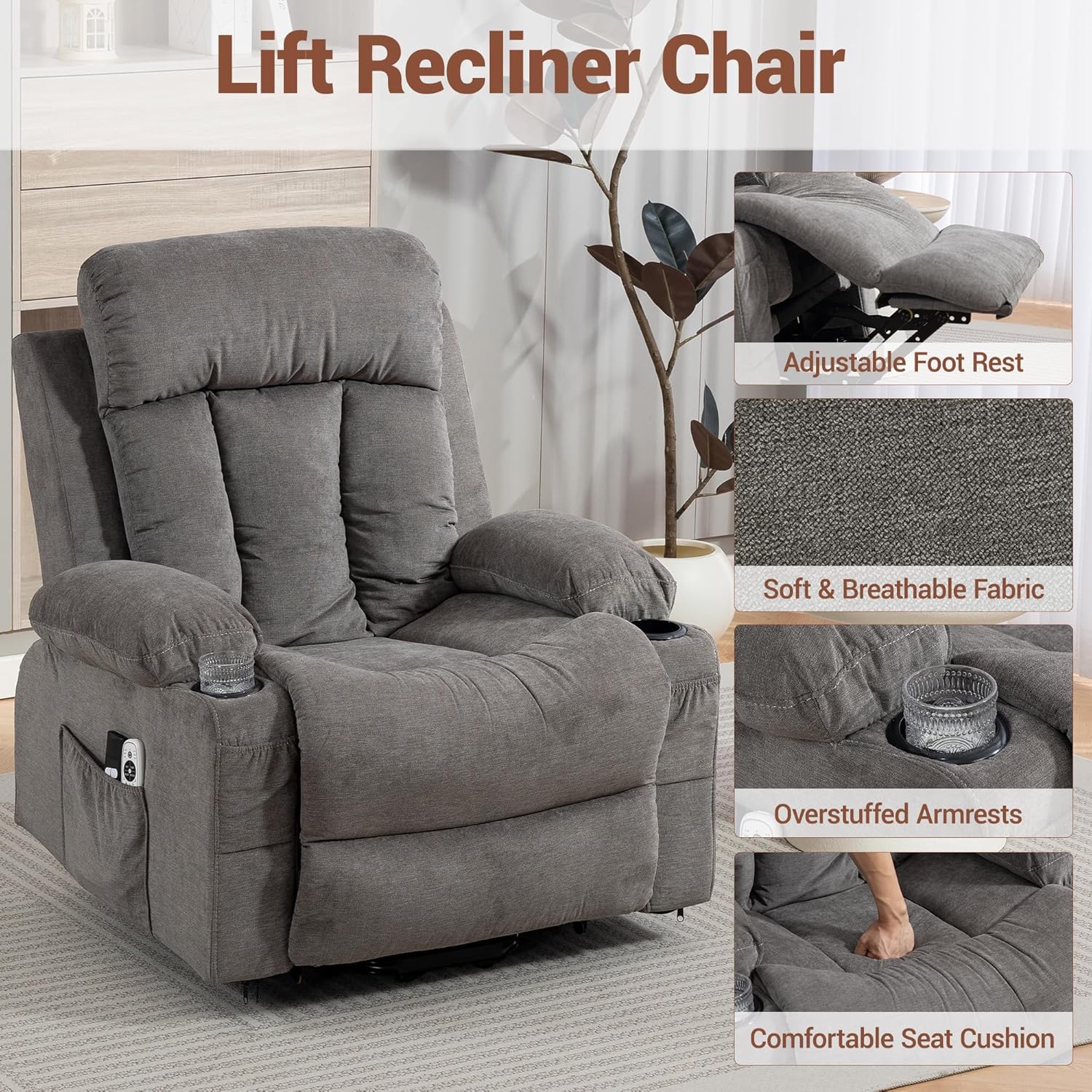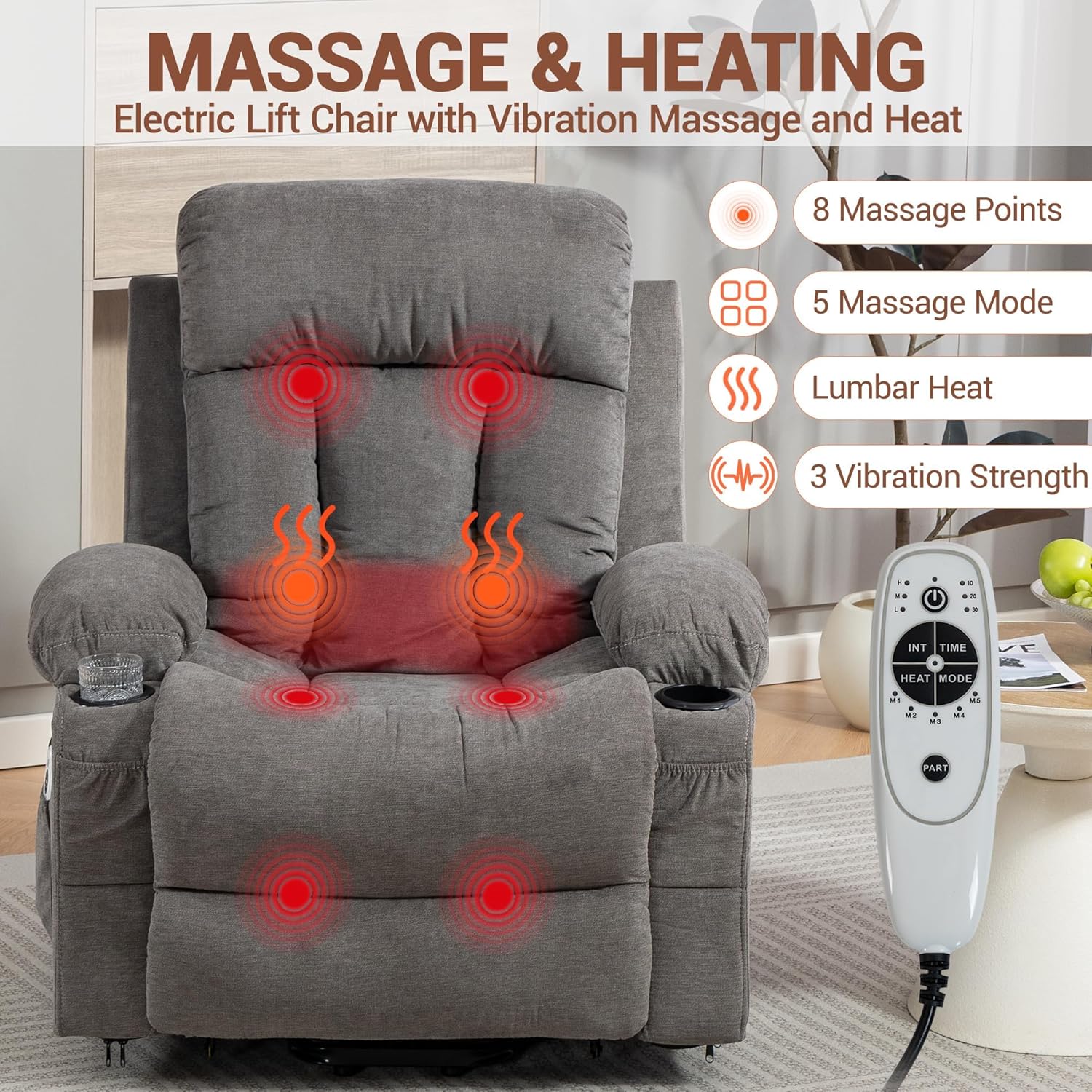 Massage & Heating FunctionThe electric recliner chair for adults featurs 8 vibration massage points for your back, lumbar, thighs and legs. The heated lift recliner offers 5 massage modes, 3 intensity levels and a timing setting for customized comfort. The lumbar heating function soothes muscle tension and promotes blood circulation.