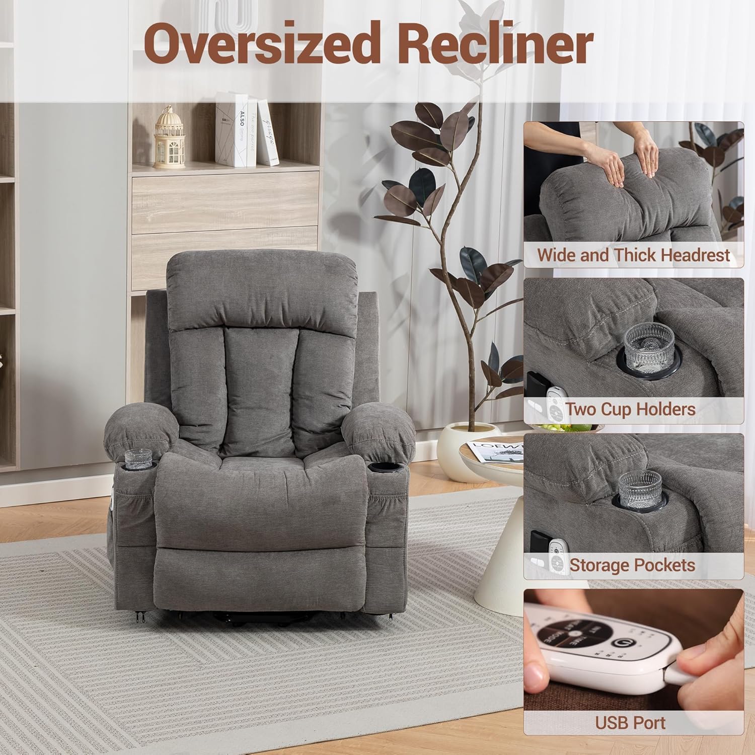 Convenient DesignThis oversized comfy recliner includes two cup holders and four storage pockets (two side + two front) so you can easily store remotes, magazines or other essentials. The USB charging port is built into the remote control, allowing you to charge low-power devices such as phones or tablets while you relax.