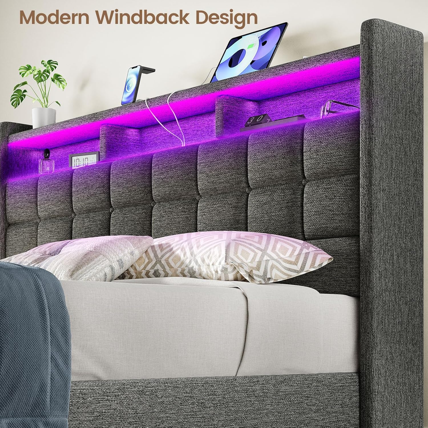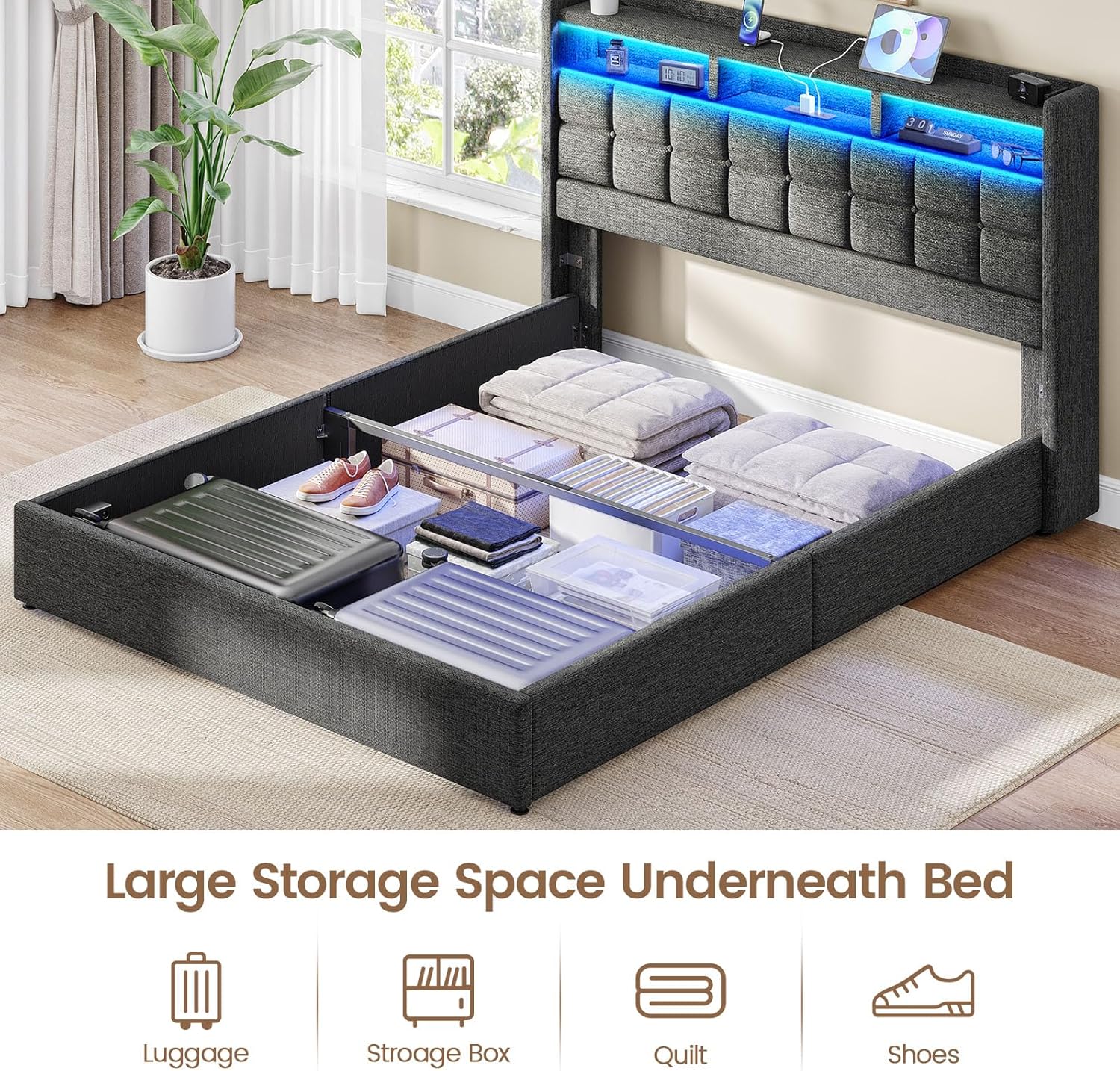 • Lift Up King Size Bed Frame with Storage, Upholstered King Bed Frame with Charging Station and LED Lights Headboard, No Box Spring Needed, Easy Assembly - Dark Grey