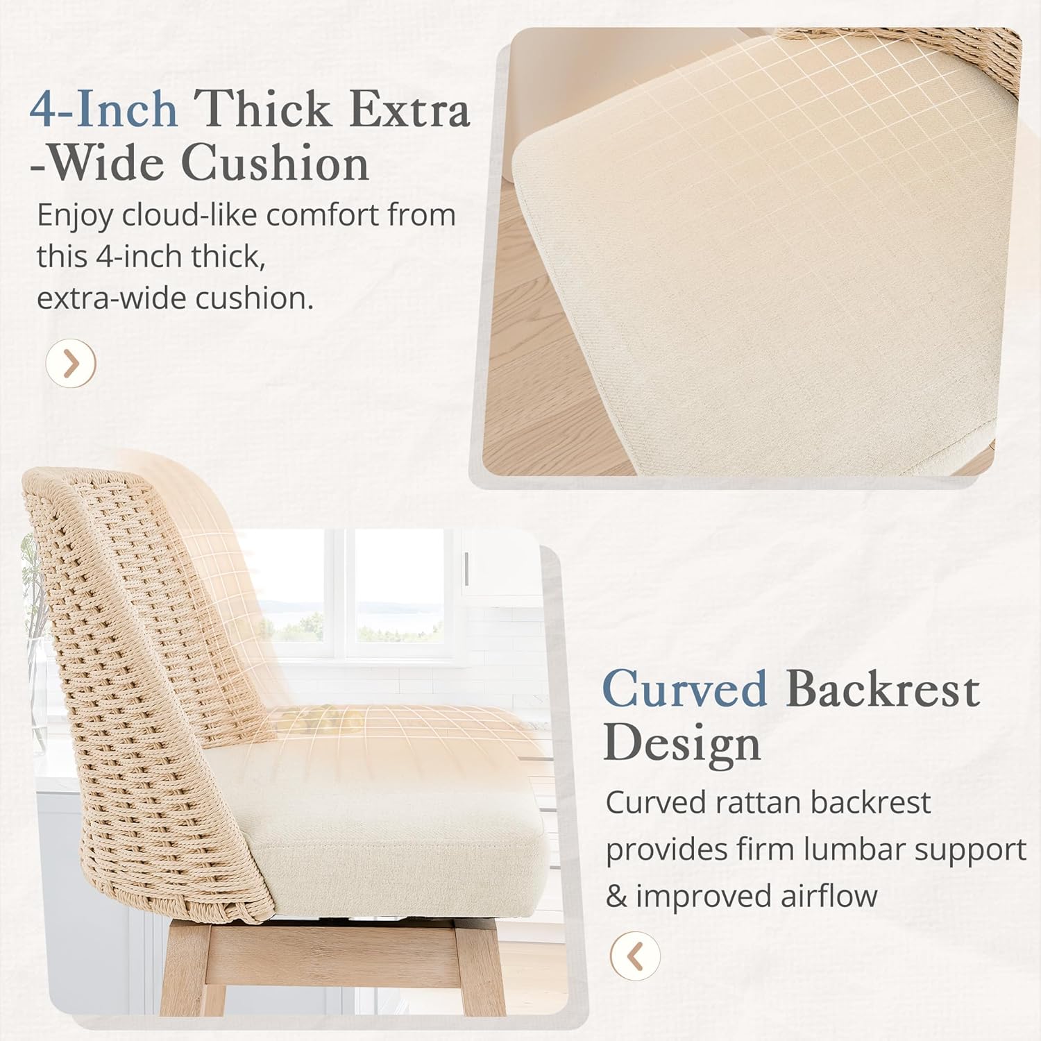 Design and Materials: Handwoven rattan backrest for authentic boho style; Solid wooden legs provide sturdy support; Ergonomic curved back enhances comfort during use