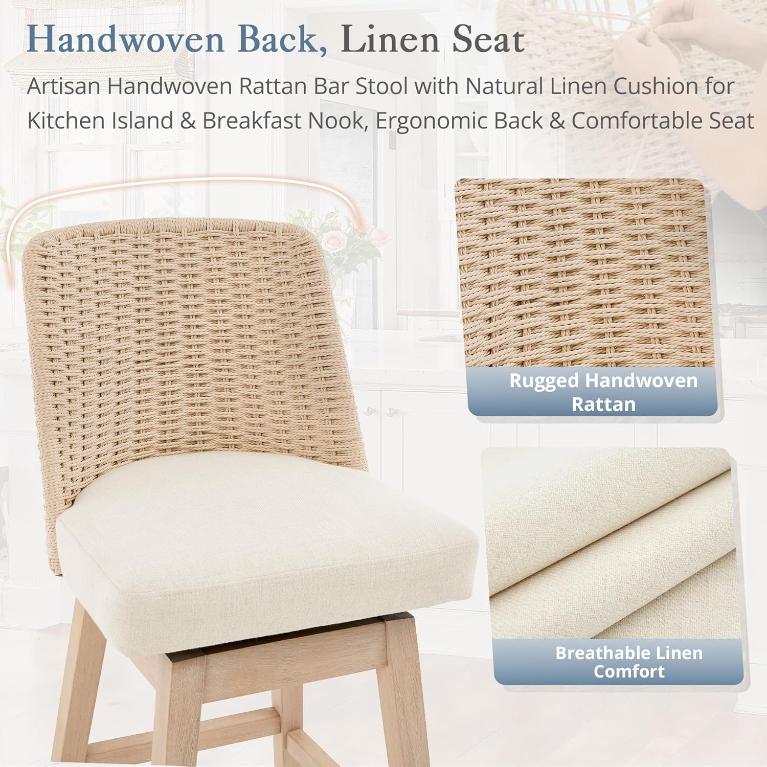 • Rattan Bar Stools Set of 3, 27 Swivel Wooden Bars Stools with Thick Linen Seat, Handwoven Back & Wooden Leg, Counter Height for Kitchen Island, Apricot