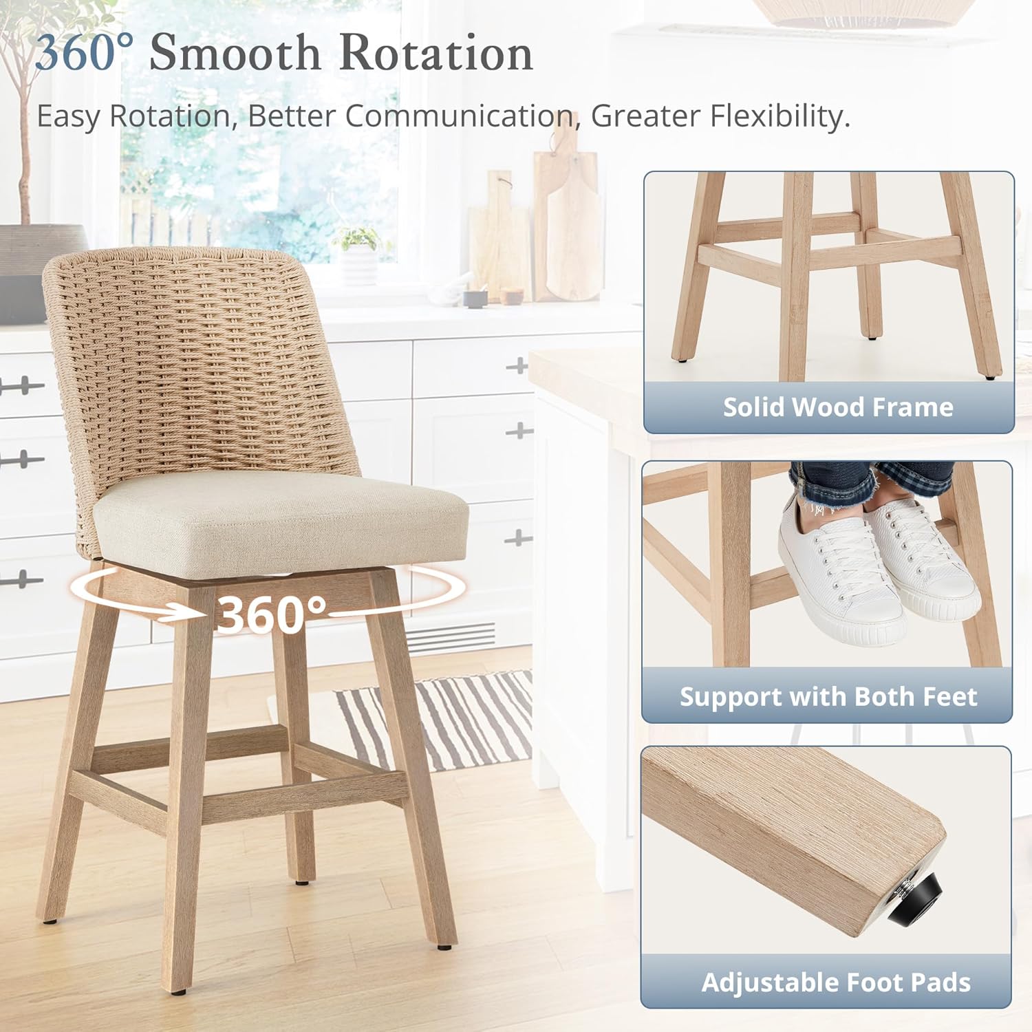 Swivel Bar Stools: Smooth 360 swivel mechanism for easy movement; sturdy construction supports up to 330 pounds; weighted base ensures stability