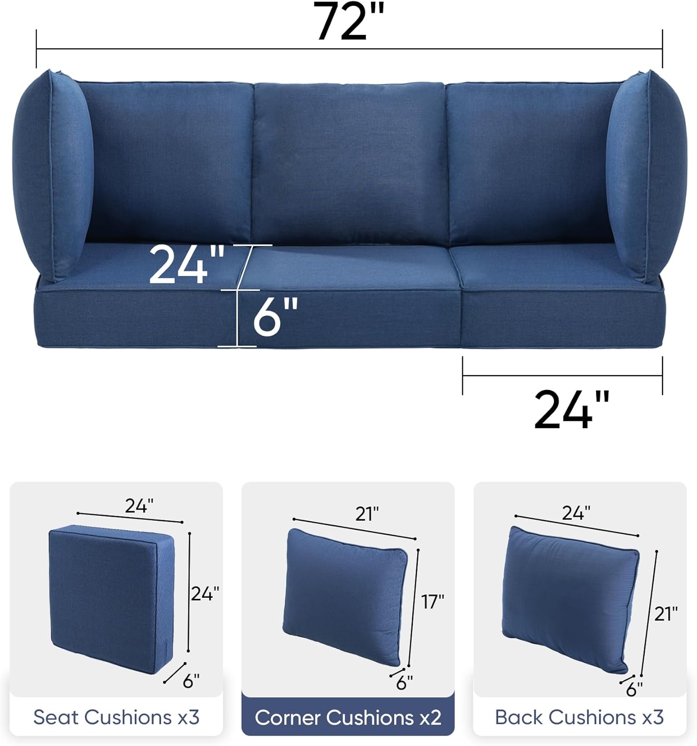 6-INCH THICK SECTIONAL CUSHIONS: Seat cushion: 24" x 24" x 6"; Back pillow: 24" x 21" x 6"; Corner Cushion: 21" x 17" x 6"