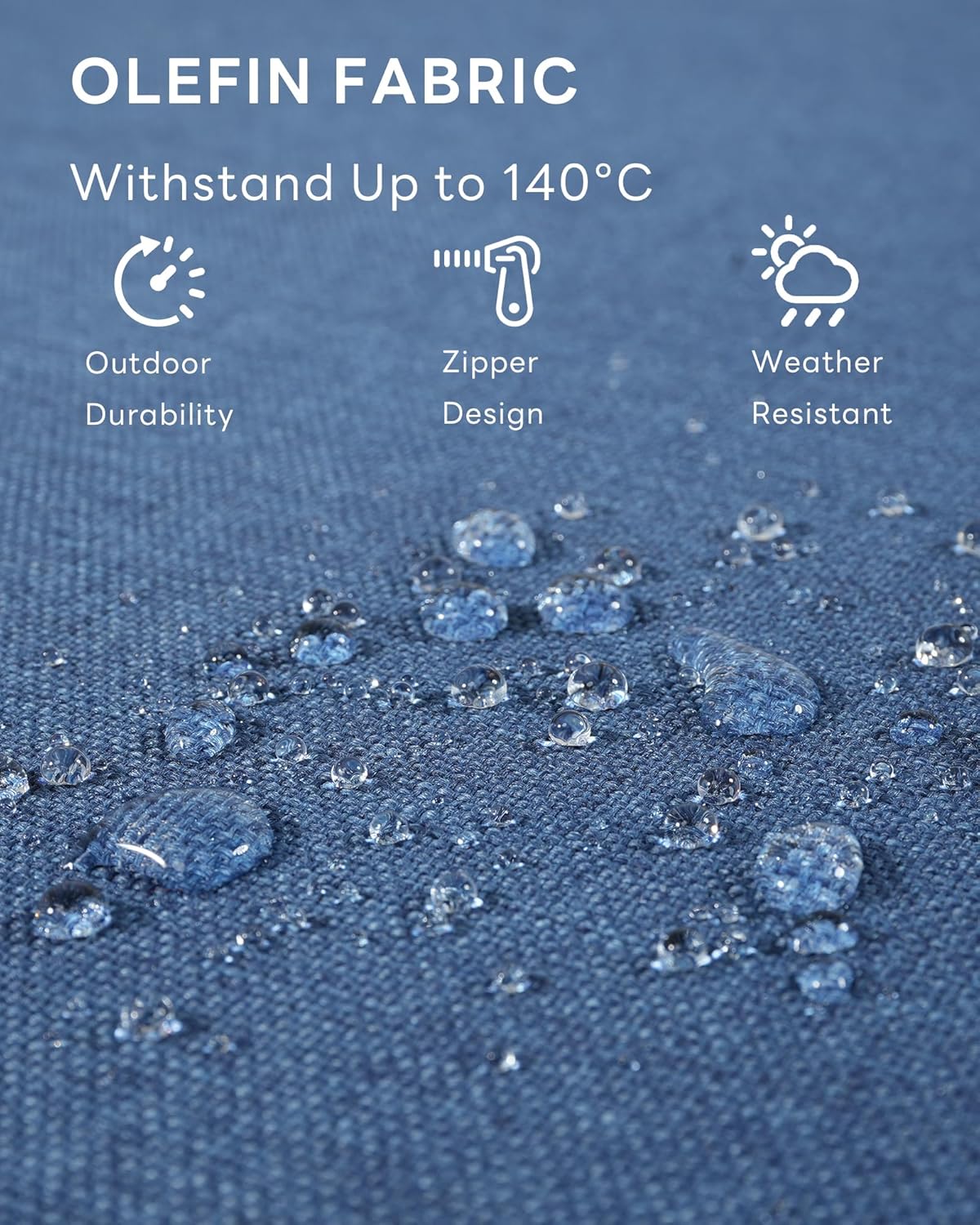 100% OLEFIN FABRIC FOR OUTDOOR USE: Built to Last; Durable washable zippered cover; Low-maintenance; UV/Water/Fade Resistant; With a melting temperature of 140C
