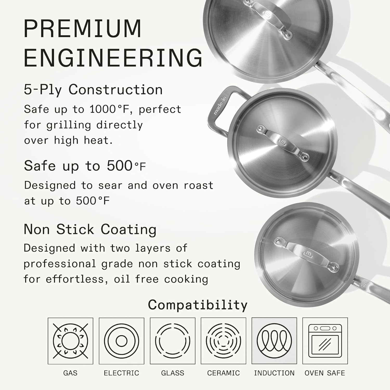Induction Cooktop Compatible - With a top layer of 430 stainless steel, these Stainless Saucepans work effortlessly with any cooktop, including induction