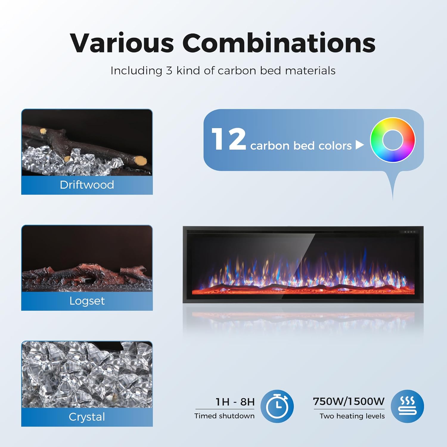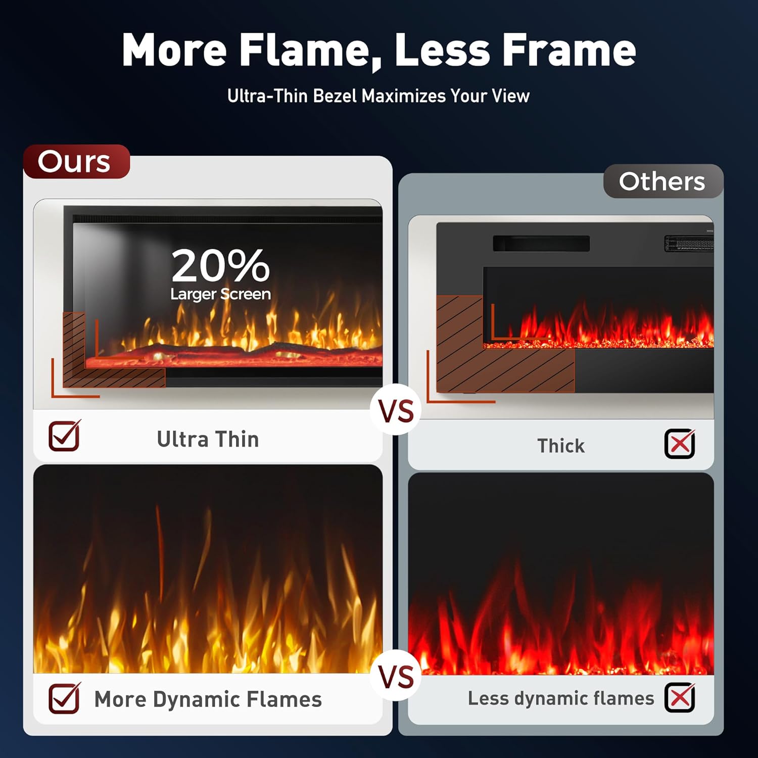 Upgraded Realistic Flame & ScreenCompared with our old type 72 inches fireplace, the upgraded 72C Type modern electric fireplace creates more realistic effects and richer colors: 1Featuring expanding screen display area and clarity provides a luxurious 3D visual experience2Including 3 kinds of bed materials -FAUX FIRE LOG, DRIFTWOOD, and CRYSTALS3Combing 7 kinds of adjustable flame colors with 12 ember bed colors imitates more authentic flame atmosphere