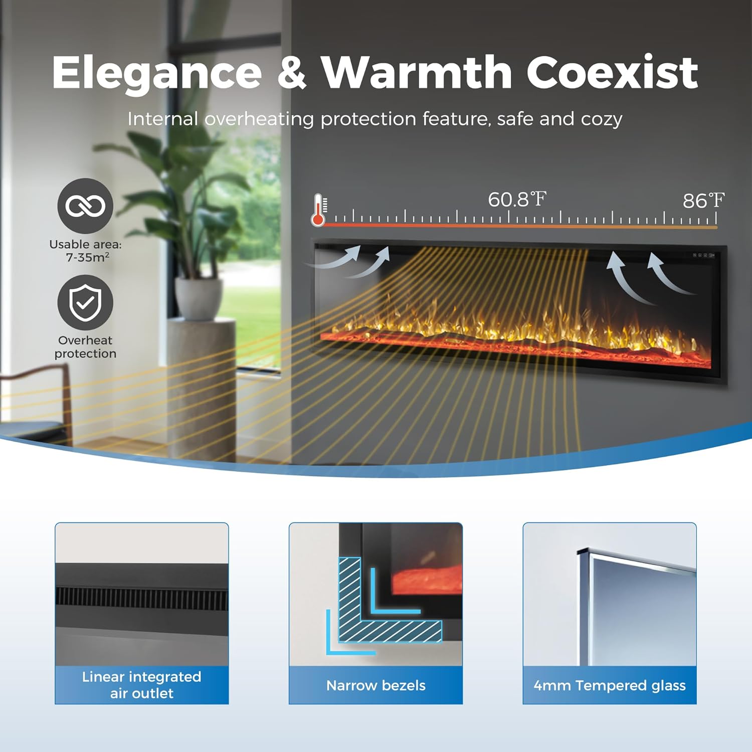 High Power & Safe Heater The linear electric fireplace is ETL certificate-approved. Its 750W/1500W front air heating system is more flexibly effective in warming room(60-86F Thermostat) and heating area up to 400 sq ft. Adapting a linear integrated design with slim air inlet and outlet openings can ensure efficient heat distribution and air circulation
