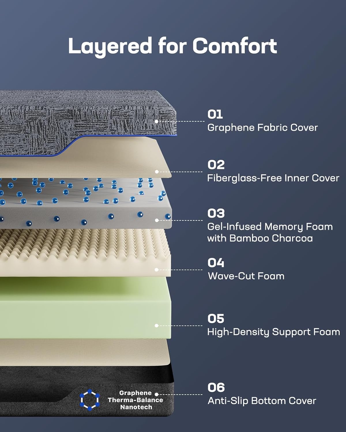Cooling Gel Memory Foam Mattress - 3-layer design with graphene-infused cover and open-cell foam keeps you cool all night while providing optimal spinal alignment.