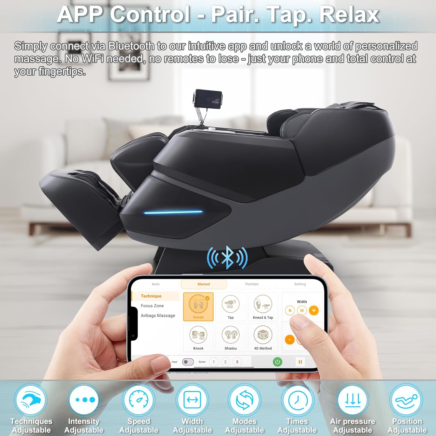 4D Massage Chair:Advanced Air Soothing Airbags and 4D Massage Technology replicate a human massage experience with 27 modes, 5 techniques, and 32 airbag points covering the entire body. Three levels of airbag pressure compress the shoulders, arms, feet, and buttocks, relieving body pain. Lower back Graphene heating therapy provides warmth for occasional and chronic strains.
