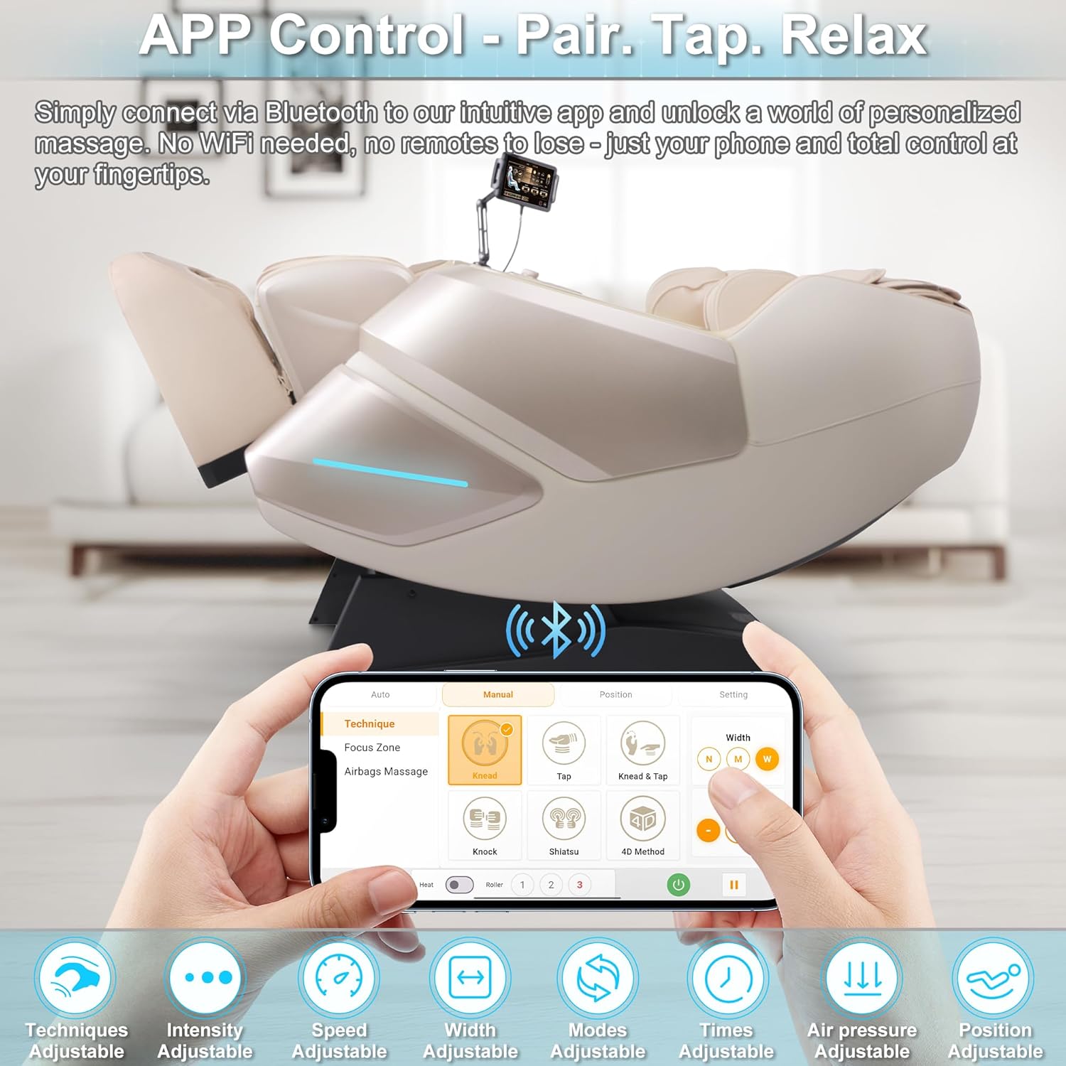 Intelligent Voice Control & Bluetooth Speaker: Intelligent Voice Control and TFT Touch Screen allow hands-free operationsimply tell the massage chair your demands, and the AI will immediately start the corresponding program. Additionally, the massage chair is equipped with a Bluetooth speaker, allowing you to enjoy music while relaxing and relieving fatigue.