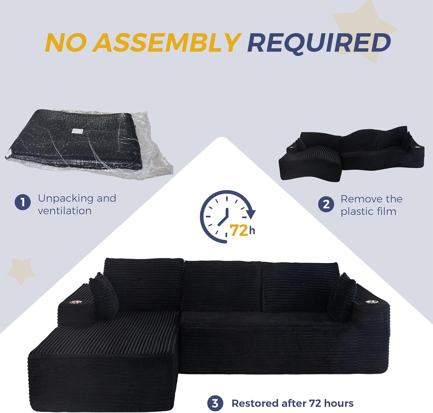 No Assembly Required: No assembly required, after opening the package, place it in a ventilated and dry environment, wait for about 72 hours or so to be able to return to its original shape, meanwhile, gently pat each part to improve its elasticity and luster, you can enjoy a comfortable experience!