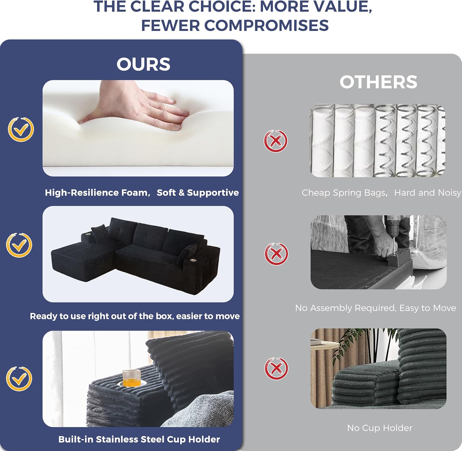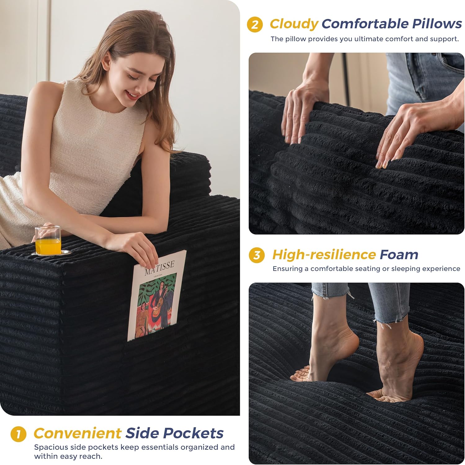 Oversized Sectional Sofa: The total width of the boneless sofa is 104 inches, which means unlimited possibilities of luxurious space for family movie watching, gathering with friends, or spending time alone, and the size of the L-shaped section allows for a natural stretching of the legs to be transformed into a sofa bed for an afternoon nap